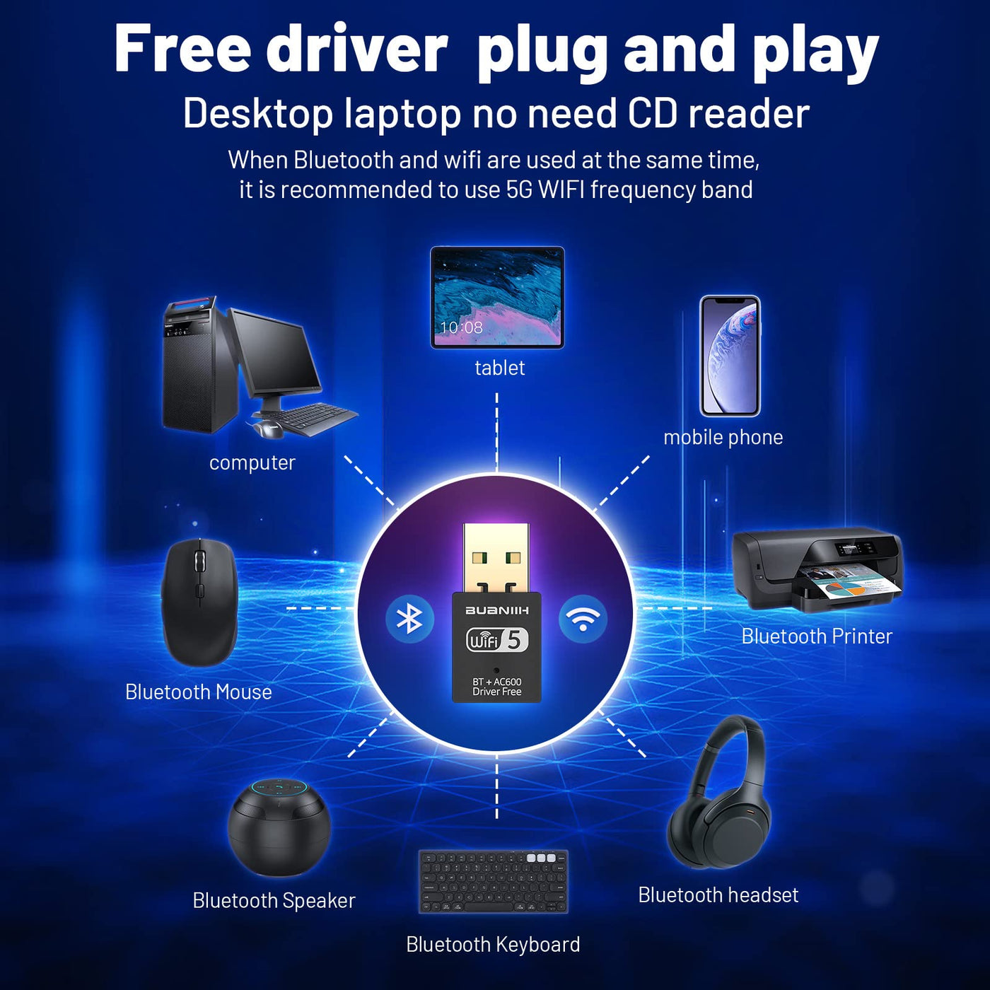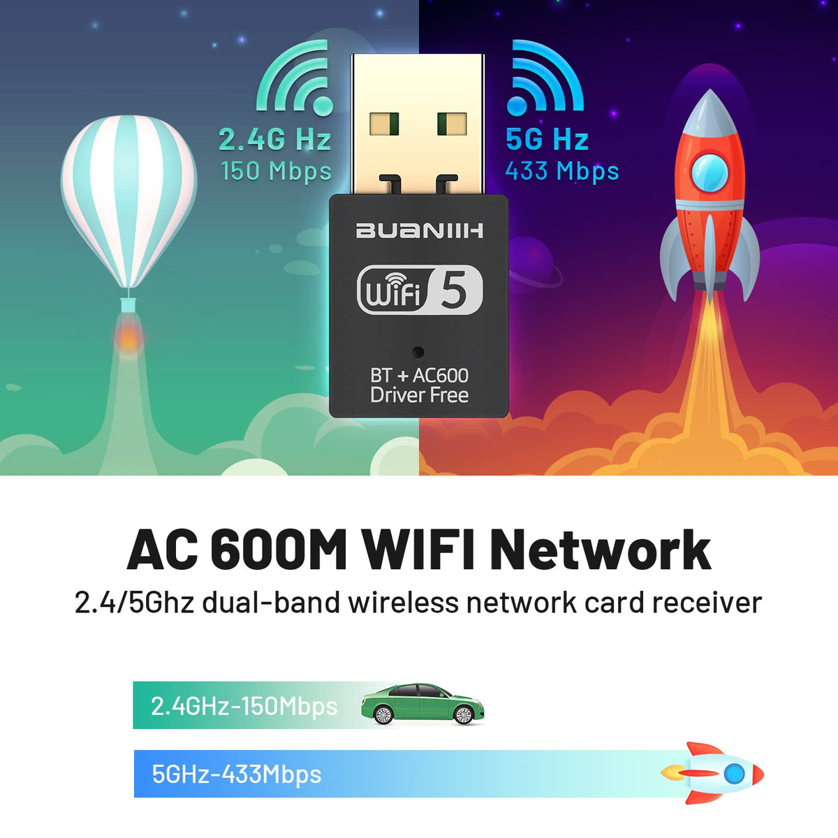 Usb Wifi Bluetooth Adapter, 600Mbps 2.4/5.8Ghz Dual Band Wireless Network Card Driver-Free,Wifi Dongle For Pc/Laptop/Desktop,Support Win7/8/8.1/10/Win 11