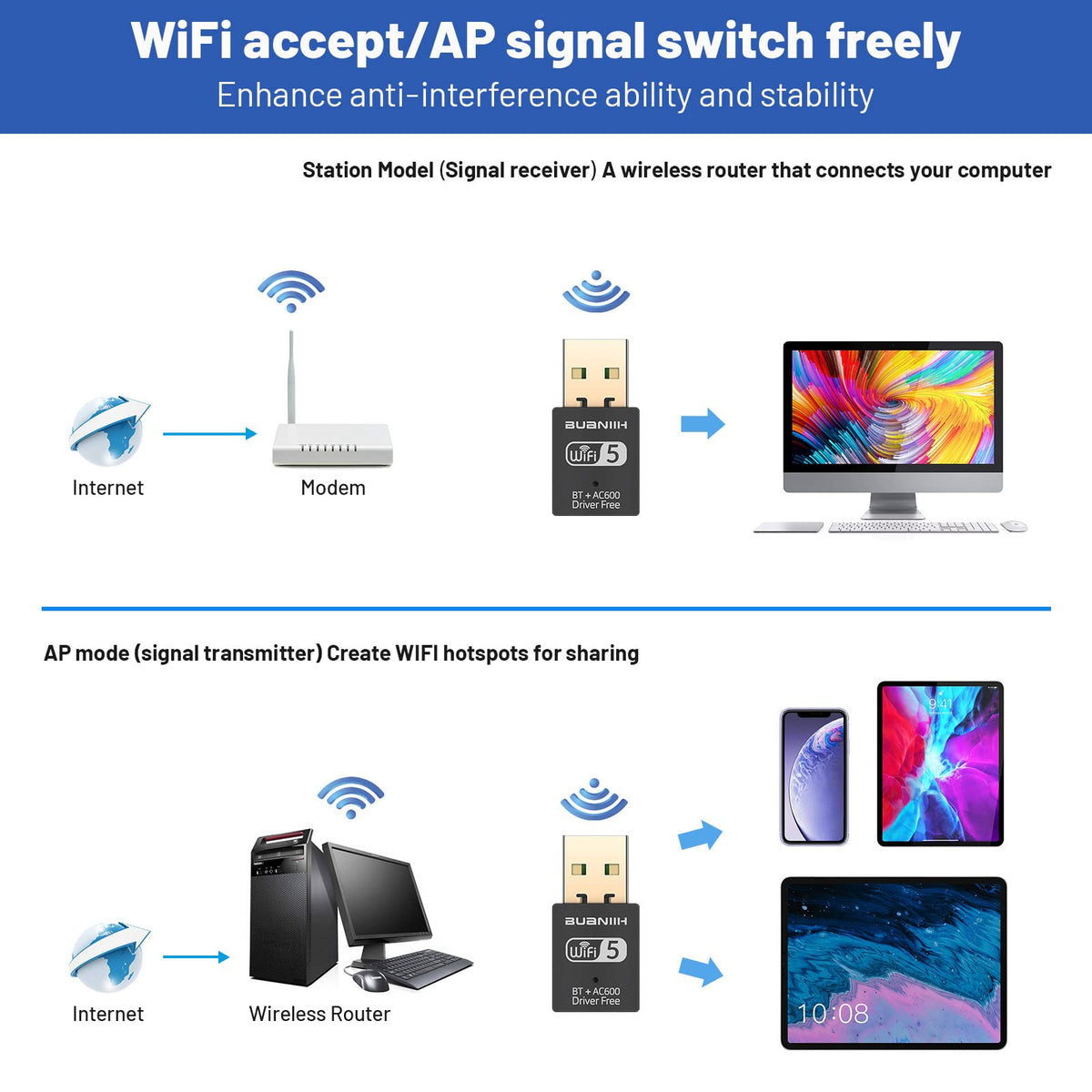 Wifi Adapter For Desktop Pc,Usb Wifi Adapter,Bluetooth Wifi 2 In 1,600Mbps 2.4/5.8Ghz Dual Band Wireless Network,Plug And Play,