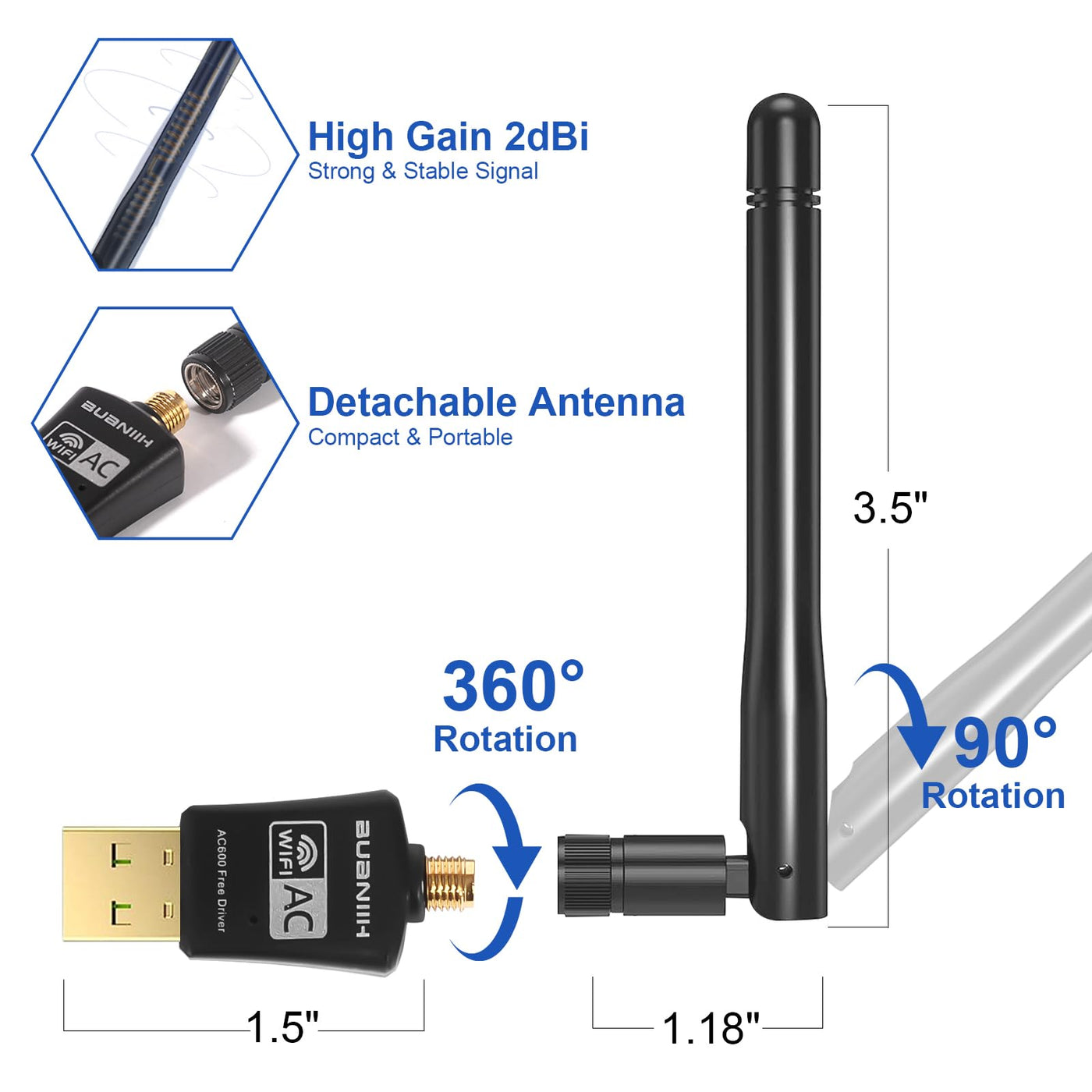 The Mini Dual-Band Usb Wireless Card Is Designed In A New Miniature Form Factor, So You Will Hardly Notice Its Presence When Plugged Into Your Computer And It Will Not Take Up Too Much Space. The Detachable External Dual-Band 2Dbi Antenna Has Been Specially Designed To Effectively Improve The Wireless Signal Reception And Enhance The Stability Of The Wireless Signal.