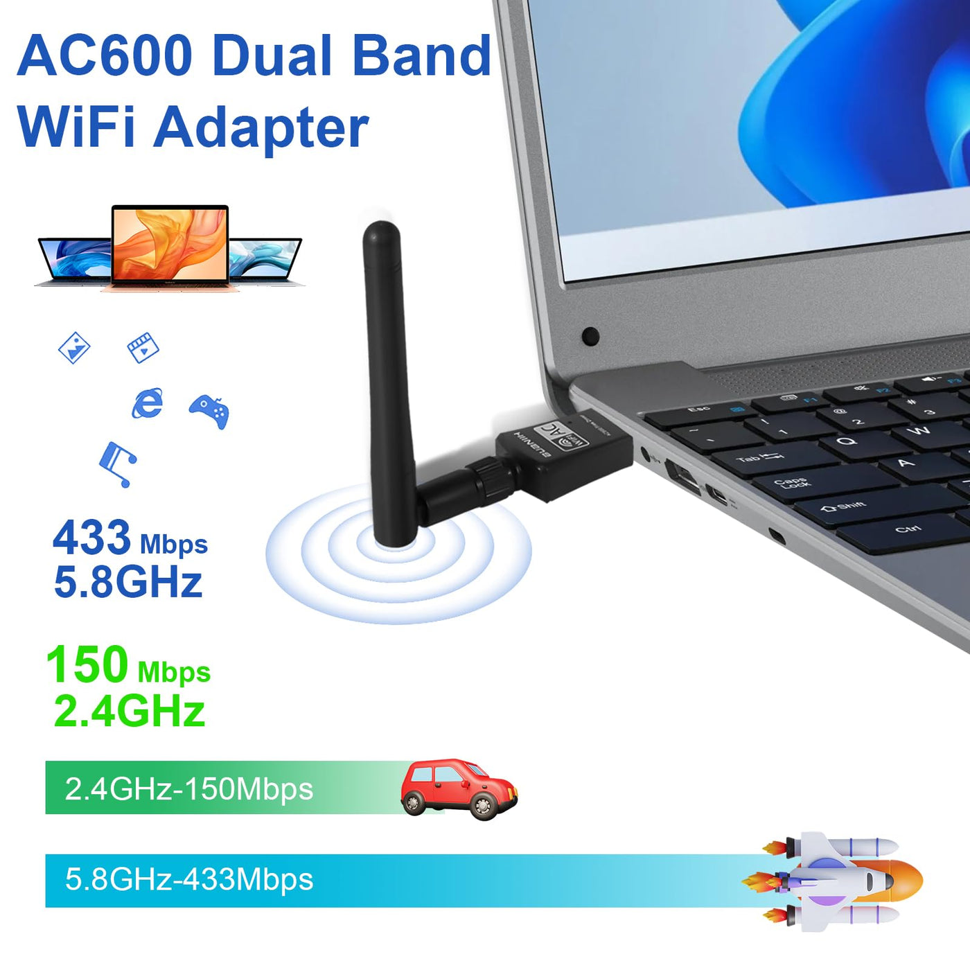 Q: What speeds can I expect from the USB WiFi adapter?A: The USB WiFi adapter supports dual-band WiFi speeds, offering up to 600Mbps total. You can achieve speeds of up to 433Mbps on the 5GHz band and 150Mbps on the 2.4GHz band, making it suitable for activities like streaming, gaming, and browsing.