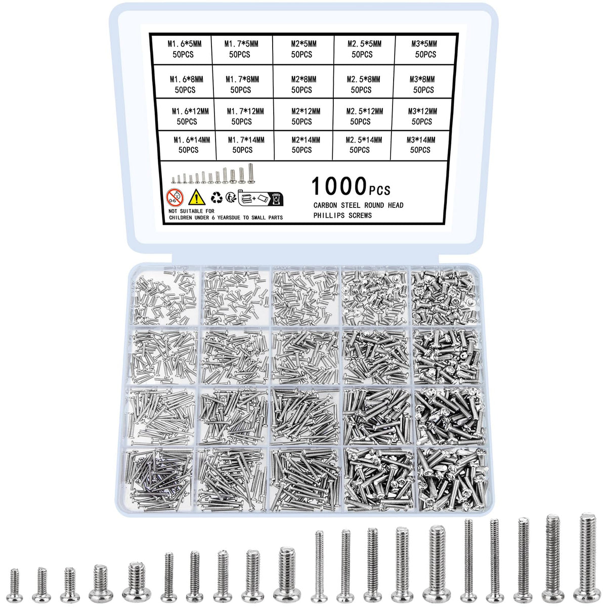 Woshilaods 1000 Pcs Tiny Screws For Electronics, M1.6 M1.7 M2 M2.5 M3 Round Head Mini Screws, Replacement Computer Screws, Small