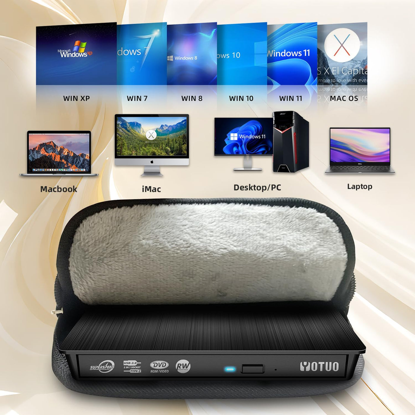 This Product Is A Portable External Cd/Dvd Drive With Usb3.0 And Type-C Dual Jacks For High Speed Operation, Plug And Play. With Cd And Vcd Burning Function, It Is Suitable For Windows Xp/2003/Vista/7/8/10/11, Linux, All Versions Of Mac Os And All Brands Of Laptops And Desktops. The Product Is Simple And Beautiful With A Thin And Light Body. It Measures Only 5.79*5.79*0.71 Inches And Weighs Less Than 14.1 Ounces. It Is Easy To Carry And Can Be Enjoyed Anywhere For Audio And Video Entertainment. We Will Include A Velvet Pouch To Protect It And Make It Easy To Carry.