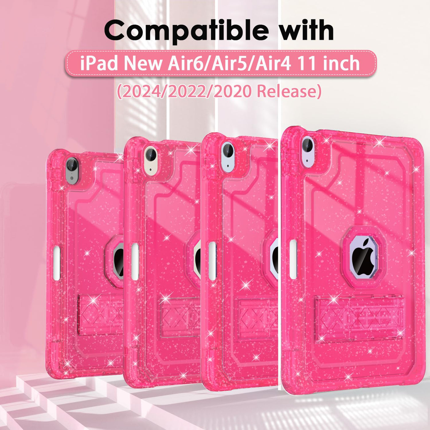 Zonefoker For Ipad Air 11 Inch Case 6Th/5Th/4Th Generation M2 11-Inch 2024/2022/2020 Case, Hot Pink Glitter Slim Cover For Kids With Pencil Holder Heavy Duty Shockproof Protective Case With Kickstand