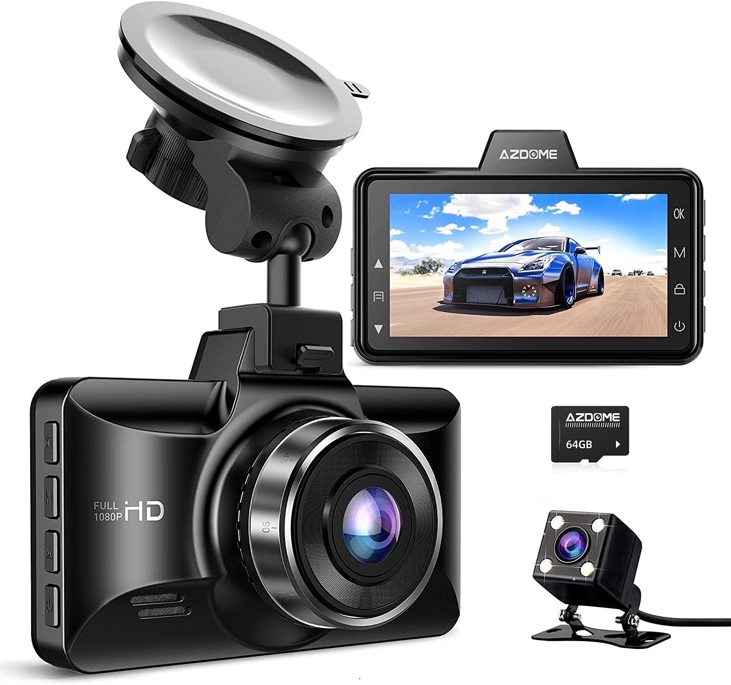 Azdome Dual Dash Cam Front And Rear, 3 Inch 2.5D Ips Screen Free 64Gb Card Car Driving Recorder, 1080P Fhd Dashboard Camera, Wat