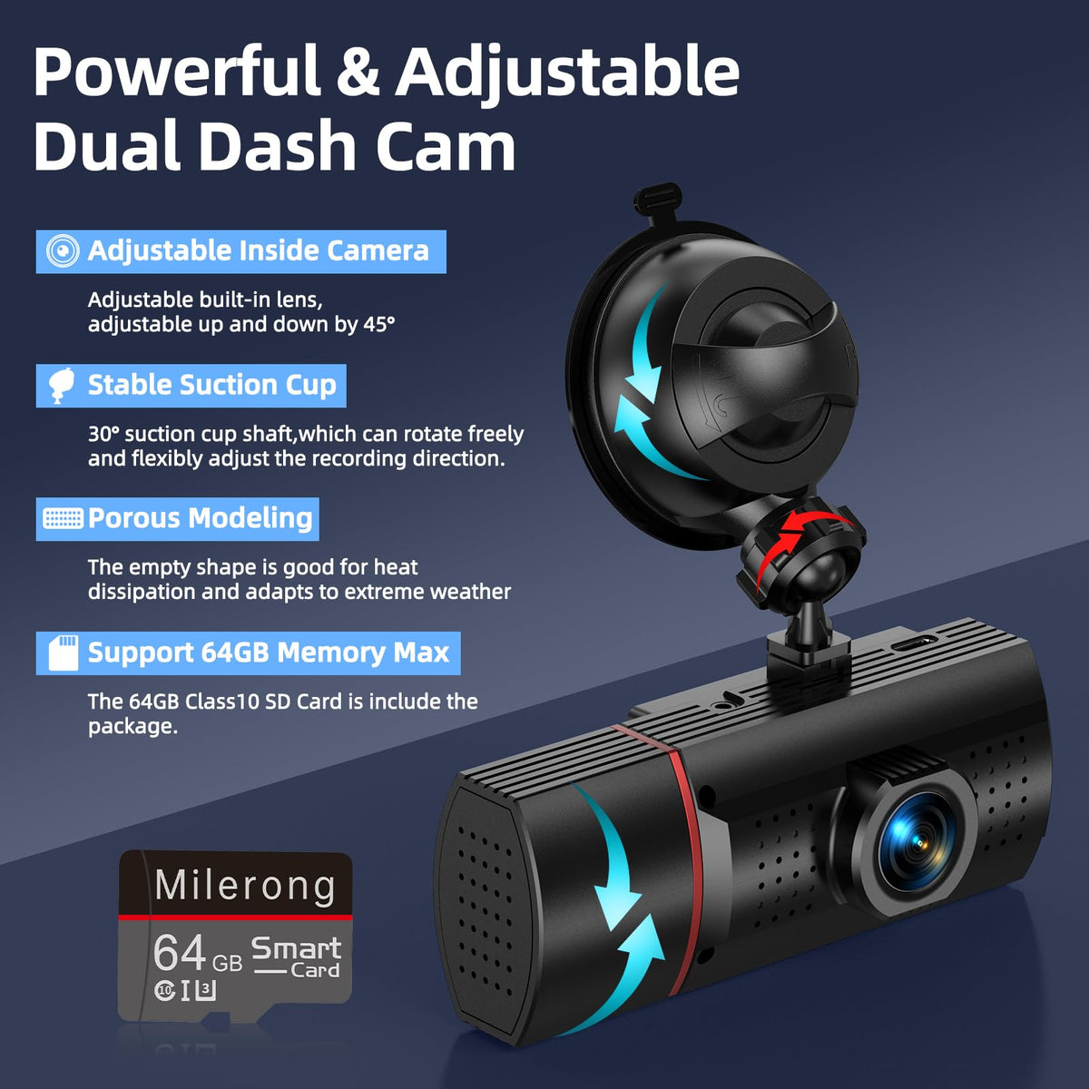 Dual Dash Cam Front And Inside With 64Gb Card,Milerong X25 1080P Dash Camera For Cars With Infrared Night Vision,Loop Recording,