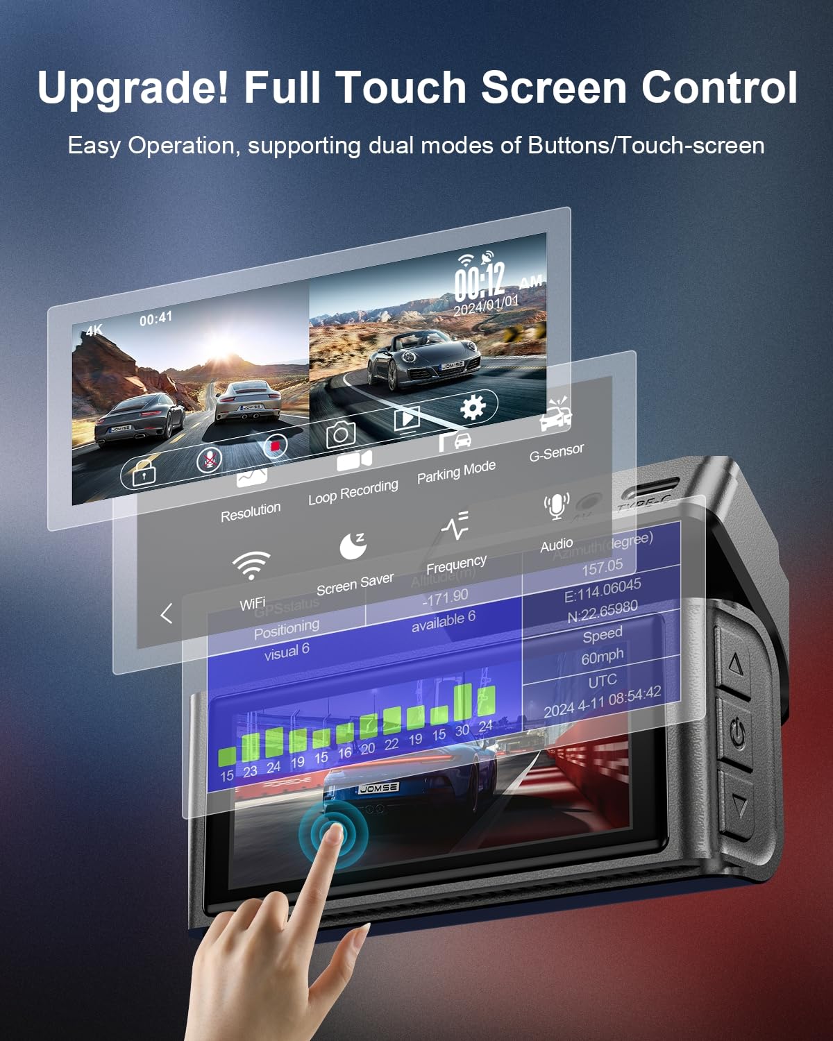 Jomise J6 Dash Cam Front And Rear, 4K Uhd Dash Camera For Cars, 3.16 Ips Touchscreen, Built-In Gps Wi-Fi, Night Vision, 170Wide Angle, Wdr, 24H Parking Mode, 64Gb Card Included