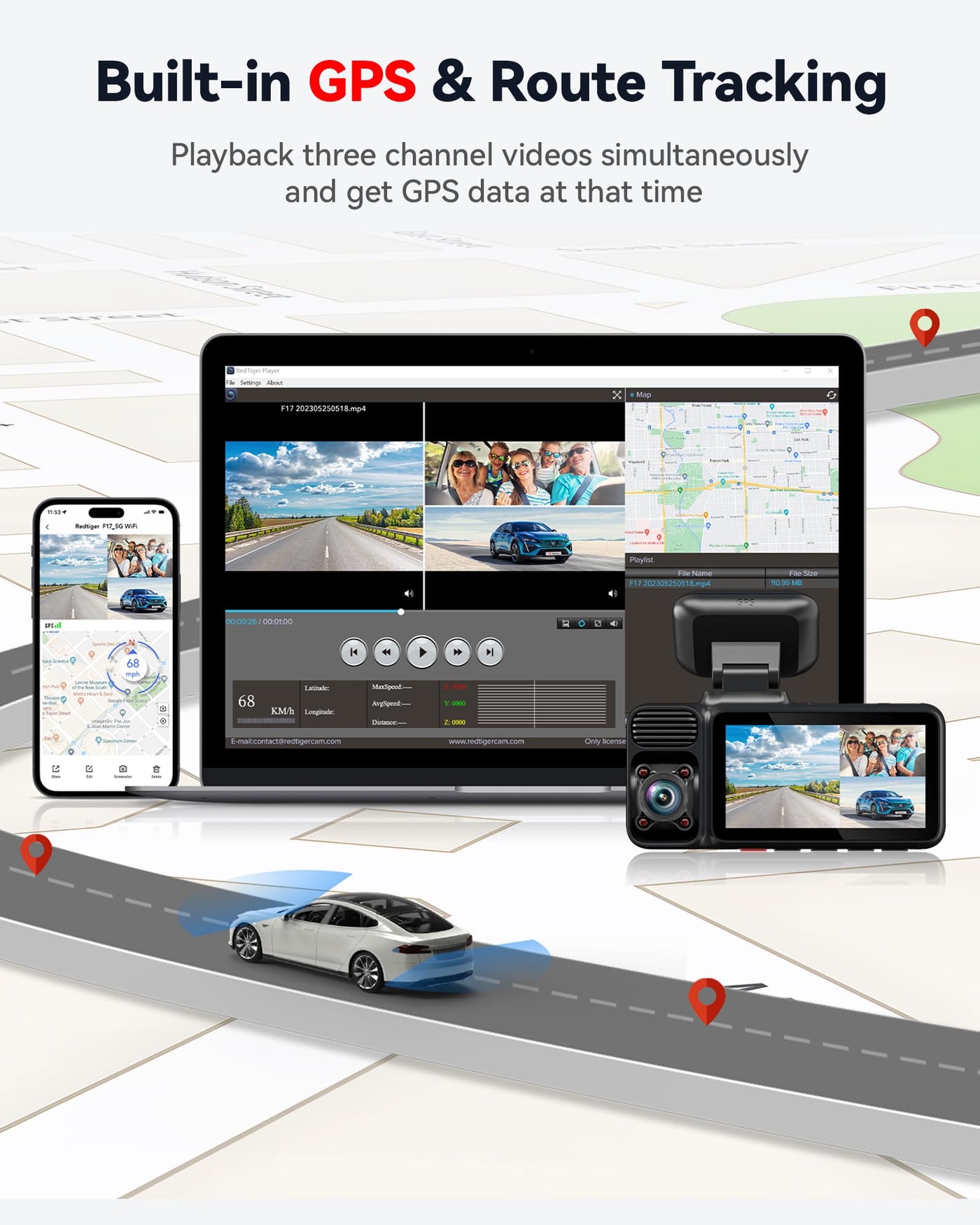 Redtiger 4K 3 Channel Dash Cam 5G Wifi Built In Gps With 64Gb Card, 2160P+1080P+1080P Front And Rear Inside Loop Recording, Trip