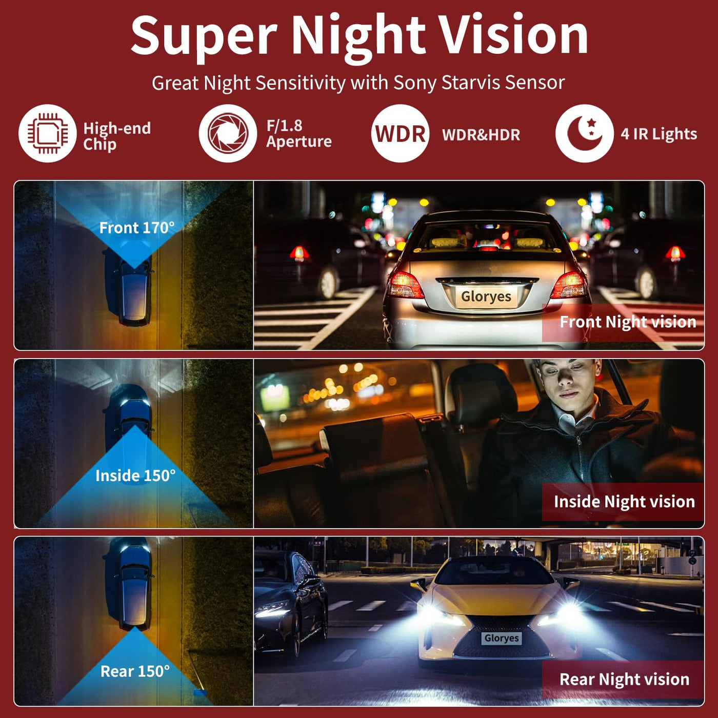 Vital Dash Cam,3 Channel Dash Cam Front And Rear Inside,Interior Car Camera,2.5K/1440P Front Car Dash Cam,Front+Interior,Front+R