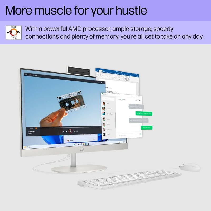 This 24'' Hp All-In-One Pc Blends The Power Of A Desktop With The Beauty Of A Slim, Modern Display Into One Dependable Device Designed To Grow With You. Tackle Your Busiest Days And Save Everything You Love With The Performance Of A Reliable Processor And Abundant Storage. A Three-Sided Micro-Edge Display Lets You See More Of Your Screen With A Pop-Up Privacy Camera That Tucks Safely Away When Not In-Use.Processor: Amd Athlon Silver 7120U 2.4 Ghz Processor (Turbo Speed: 3.5 Ghz)Graphics: Amd Radeon Graphicsmemory: 8Gb Ddr4 Ramstorage: Upgraded To 2Tb Nvme Ssdoperating System: Windows 11 Homedisplay: 23.8'' (60.5Cm) Diagonal, Fhd (1920 X 1080), Ips, Three-Sided Micro-Edge, Anti-Glare, 250 Nits, 99% Srgb, Non-Touch Screenaudio: Dual Front-Facing Speakers, Hp Audioports:2X Superspeed Usb Type-A 5Gbps Signaling Rate1X Usb Type-C 5Gbps2X Usb 2.0 Type-A1X Hdmi Out1X 10/100/1000 Base-T Network (Rj-45)1X Headphone/Microphone Combo1X Media Card Readerwireless Connectivity: Wi-Fi 6 And Bluetoothkeyboard: Usb White Wired Keyboard And Mouse Combocamera: Hp True Vision 720P Hd Privacy Camera With Integrated Dual Array Digital Microphoneweight: 11.61 Lbsdimension (W X D X H): 21.28 X 7.33 X 16.11 Inchescolor: Snow Whiteaccessory: Ratea Accessories (64Gb Micro Sd Card, 4-In-1 Usb 3.0 Hub)