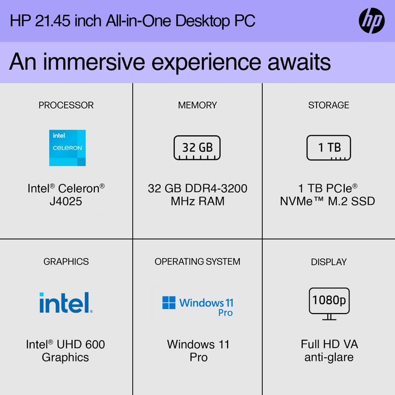 Hp All-In-One Desktop Computer, 21.5'' 1080P Fhd Display, 32Gb Ram, 1.5Tb Storage (1Tb Ssd+500Gb Ext. Drive), Dual-Core Intel Ce
