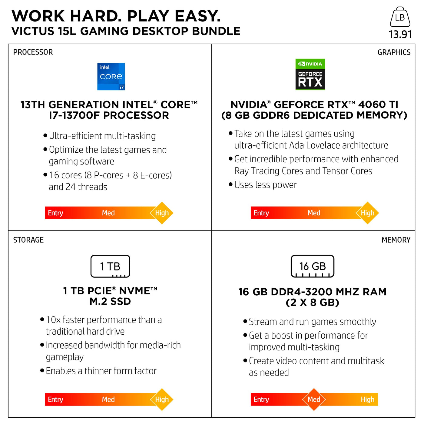 Victus By Hp 15L Gaming Desktop, Intel Core I7-13700F Processor; 16-Core; Up To 5.2 Ghz With Intel Turbo Boost Technology; 30 Mb Cache; 16Gb Ddr4-3200 Mhz Ram Memory (2X8 Gb) (Expandable To 32Gb); 1 Tb Pcie Nvme M.2 Ssd; Nvidia Geforce Rtx 4060 Ti Graphics Card With 8Gb Gddr6 Dedicated Memory; Wi-Fi 6 (2X2) And Bluetooth 5.3 Wireless Card (Supporting Gigabit Data Rate); 5.1 Surround Sound; Windows 11 Home; Hyperx Bundled Accessories: Hyperx Alloy Core Rgb Wired Keyboard, Hyperx Pulsefire Core Wired Mouse Black; Hp Finish In Mica Silver