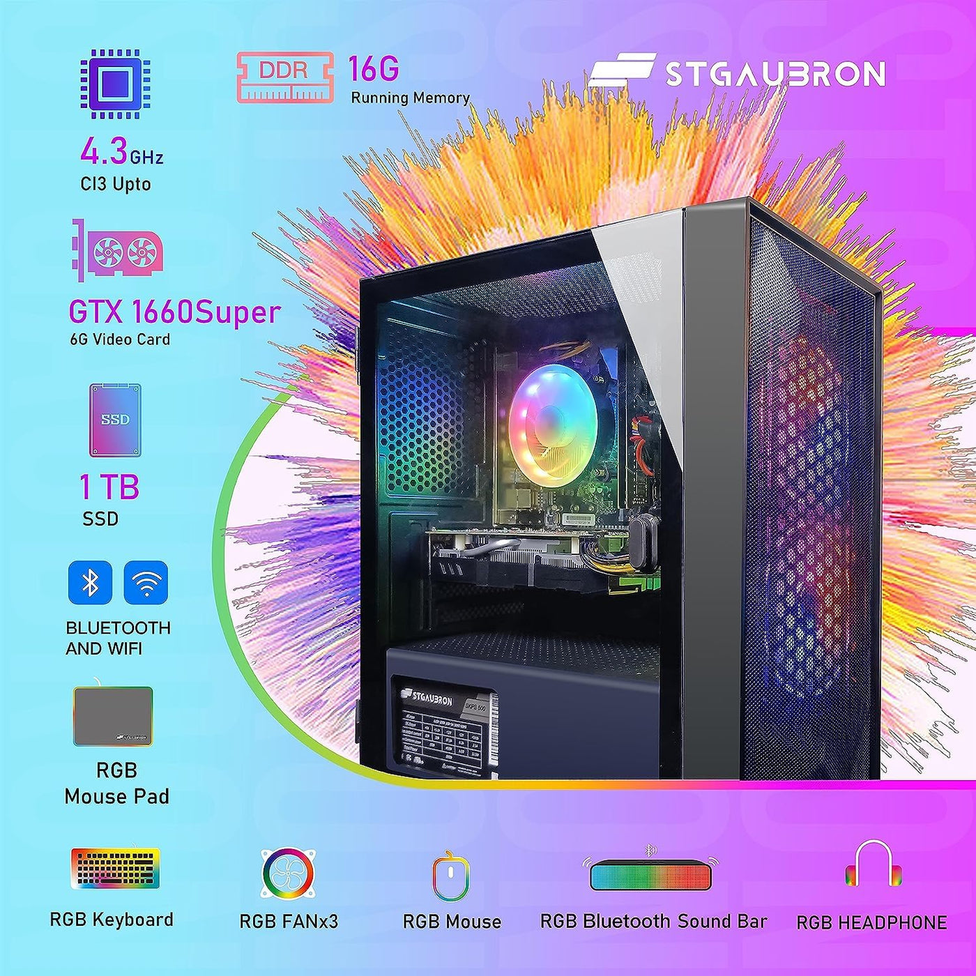 Stgaubron Gaming Pc,Geforce Gtx 1660 Super 6G Gddr6,Intel Core I3-10100F Up To 4.3G,16G Ddr4,1T Ssd,600M Wifi,Bt 5.0,Rgb Fan X 3,Rgb Keyboard&Mouse&Mouse Pad,Rgb Bt Sound Bar,Rgb Bt Gaming Mic,W11H64
