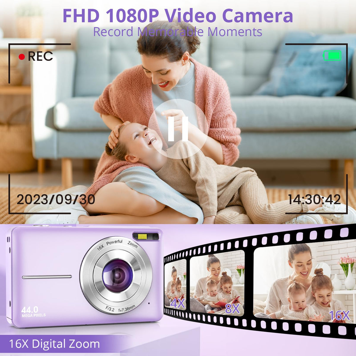 Fhd 1080P 44Mp Kid S Digital Camerawith Fhd 1080P Video Resolution And A Remarkable 44Mp Image Resolution, Coupled With An Advanced Cmos System, You Can Capture And Record Your Most Exciting And Memorable Moments With Stunning Clarity And Detail.Your First Choice For Photography Equipped With A Range Of Features, Including 16X Digital Zoom, Anti-Shake, Face Detection, White Balance, Continuous Shooting, Self-Timer, Video Recording With Pause Functionality, And 20 Different Filters, This Digital Camera Is An Ideal Choice For Those Interested In Simple Yet Creative Photography. The Perfect Gift Option With Its Stylish Appearance And Palm-Sized Compact Shape, This Digital Camera Makes For The Perfect Gift. Its Super-Easy-To-Operate Features Make It Suitable For Beginners, Kids, Teens, Students, And The Elderly. Say Goodbye To Complicated Settings And Hello To Capturing Wonderful Moments With Just The Press Of A Button. What You Will Get? A Digital Camera, A 32Gb Tf Card, A Rechargeable Battery, Usb Cable And Adapter, A Camera Bag, A Lanyard, A Lens/Lcd Screen Cleaning Cloth, And A User Manual.All These Accessories Are Included To Ensure That The Camera Is Ready To Use Straight Out Of The Box.