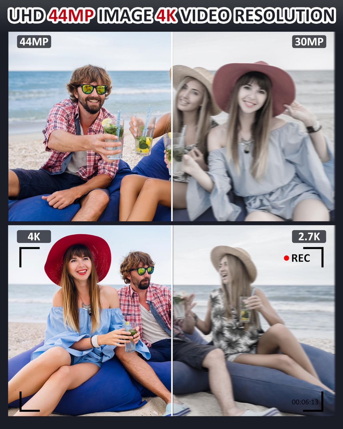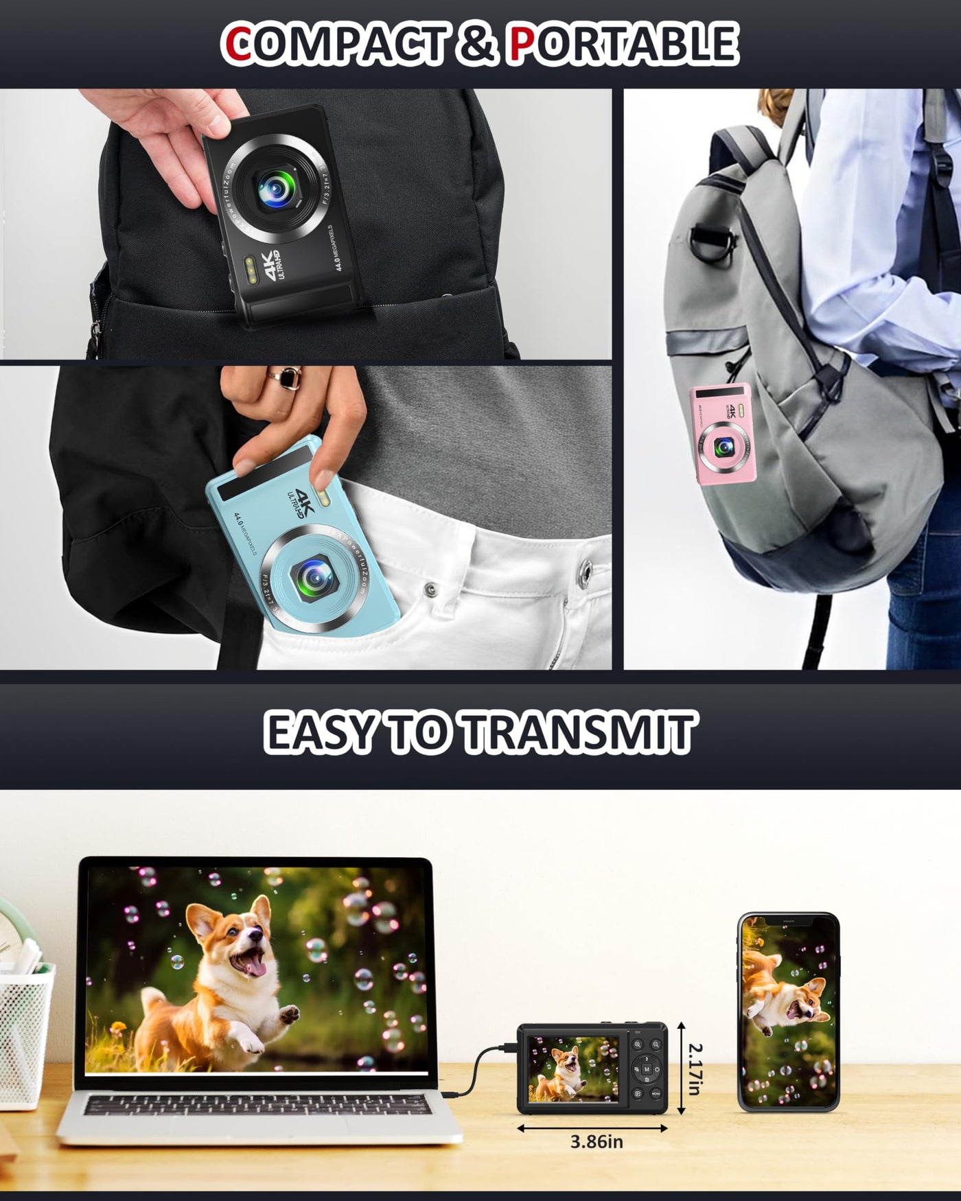 ???44Mp & 4K Uhd Digita Camera?The Vlogging Camera Captures Stunning Ultra-High-Definition 44 Mp Images And 4K Videos Effortlessly With The Latest Cmos Metering System. It Automatically Delivers Natural, Vibrant Colors And Clear, Vivid Details Without The Need For Complex Manual Settings. Recording Your Most Exciting And Memorable Moments Has Never Been Easier. | ???Autofocus & 16X Digital Zoom?Upgraded Autofocus On This Point And Shoot Digital Camera Ensures No More Blurry Or Out-Of-Focus Shots, So You'Ll Never Miss A Captivating Moment. The Powerful 16X Digital Zoom Allows You To Capture Clear Images Even From A Distance, Providing A Unique Photography Experience. | ???Multifunctional Camera Unleashing Creativity?This Feature-Rich Small Camera Doubles As A Webcam For Live Streaming And Video Blogging. The Built-In Flash Ensures Clear Photos Even In Low-Light Conditions, While The Integrated Microphone Enhances The Vibrancy Of Your Vlogs. Explore Features Like Time-Lapse, Slow Motion, Burst Mode, Selfie Mode, Webcam Functionality, Smile Recognition, And Various Creative Filter Effects To Create Engaging And Fun Photos. | ????Compact Travel Camera?The Portable Camera Small Yet Powerful, Weighing Only 0.24 Pounds With A 2.4-Inch Screen That Captures Expansive Views. Included Protective Pouch And Lanyard Allow You To Easily Carry It On All Your Photography Adventures. Comes With A 32Gb Memory Card, Two Rechargeable Batteries, And A Usb Data Cable, Ensuring You'Re Prepared For Your Next Trip Or Vacation. | ???Easy To Operate & Perfect Gift?Designed For Effortless Use, This Mini Camera Meets The Daily Photography Needs Of Of All Ages. Its Intuitive Buttons And Simple Menus Ensure Capturing Every Moment Is As Easy As Pressing A Button. It'S A Thoughtful Gift For Teen Boys, Girls, Parents, Or Anyone Who Loves Photography, Making A Delightful Surprise For Birthdays, Christmas, Or Any Special Occasion.