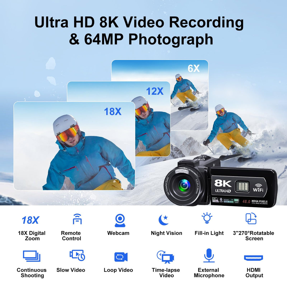 Ourlife 8K Video Camera Camcorder, Uhd Digital Camcorder 8K/15Fps 4K/60Fps 5K 6K/30Fps Adjustable, 3 Touch Screen 18X, 64Mp Phot