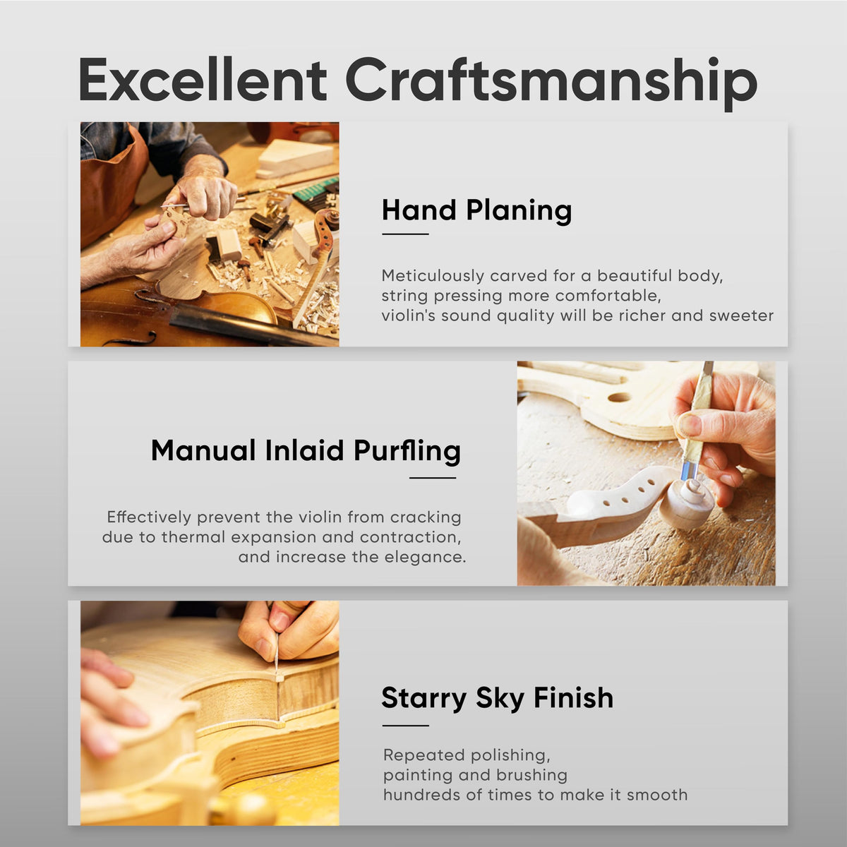 Phoenix Violin 4/4 Full Size Set, Fiddle Solid Wood For Professional Beginners Adults Kid With Ironwood Octagonal Bow & Rosewood Bow Extra Strings & Bridge, 2 Rosins, Tuner, Mute, Case (Full)