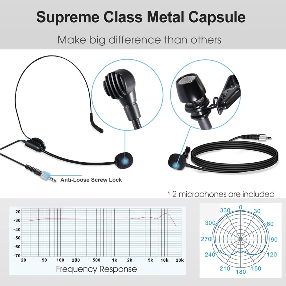 Alvoxcon Uhf Two Channel Wireless Headset/Clip Microphone System Comes With Portable Design, Rechargeable Belt Pack Transmitters (Headset / Clip On Microphone) And Receiver (1/4 Output Plug). Ideal For Filming, Vlogging, Youtube Recording, Presentation, Lecturing, Training Etc. It Is Preset With 902- 928 Mhz And Complies With The New Fcc Regulations For Wireless Microphone Large Application - 1/4 Output Plug From This Wireless Microphone Receiver Works With Any Mixer, Pa System, Loud Speaker, Voice Amplifier, Karaoke Machine Only If They Comes With 1/4 Mic In Input Jack. It Also Works With Dslr Camera, Tablet, And Smartphones (Not For Android Phones) With The Included Cable For Audio Recording, Filming, Interviewing, Etc. Note: 1.It Does Not Work With Macbook Or Android Smartphones 2.It Does Not Works With Bluetooth Speaker 3.It Does Not Work With Laptop Or Pc Computer4.Please Volume Down External Audio Device Before Plug In The Receiver, Then Volume Up Slowly For Comfortableness & Avoid Feedback. 5.Press The Receiver On The Hot Shoes Mount Till A Click Is Heard For Secure Lock When Work On Camera Rechargeable Wireless Microphone With Volume Control Both Transmitter & Receiver Are Rechargeable And Powered By Built-In Battery. Battery Status, Frequency Are Displayed On Lcd Of The Body Pack Transmitter. Packing Details 2 X Body Pack Transmitter 1 X Mini Receiver 2 X Headset Microphone 2 X Lavalier Microphone 1 X Smartphone Adaptor Cable 1 X Hot Shoe Mount Adaptor 1 X Adaptor (3.5Mm - 3.5Mm For Work With Camera) 1 X Charging Cable 1 X Manual