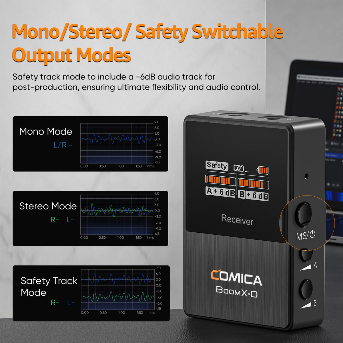 Comica Boomx-D2 2.4G Digital 1-Trigger-2 Wireless Microphone.Wireless Camera Microphone Widely Applied To Conference,Speech, Web Podcast,Youtube, Outdoor Live, Video Recording, Conference, Vlogging, Church, Interview, Teaching, Asmr .Etc. Main Features: 2.4G Digital Wireless, Global Free Frequency. Dual Transmitters Triggered By One Receiver. Visual Power, Audio Dynamic Monitor And Other Display Functions. Internal And External Mic Two Input Modes. Mono/Stereo Switchable Output Modes . Real-Time Audio Monitor. Broadcasting Quality Audio. Rf Technology, Auto Freq. Adjustment, Stable Transmission. Low Latency < 20Ms. Working Range Up To 200M. Designed With Multi-Functional Belt Clip And Compact. Specification: Transmitting Power: 10Dbm. Receiving Sensitivity:-86Dbm. Antenna:Pcb Antenna Polar Pattern:Omnidirectional. Sound Delay:
