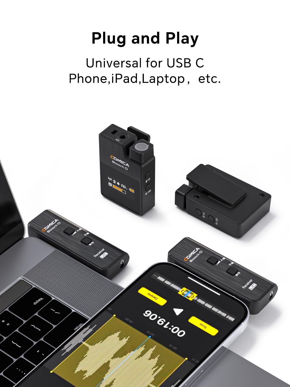 Thanks For Purchasing Comica Boomx-D 2.4G Digital 1-Trigger-2 Wireless Microphone. To Ensure Bring You A Good Using Experience, Please Read This Manual Book Carefully Before Using And Correctly Install And Operate.Main Features2.4G Digital Wireless, Global Free Frequency. Dual Transmitters Triggered By One Receiver. Visual Power, Audio Dynamic Monitor And Other Display Functions. Internal And External Mic Two Input Modes. Mono/Stereo Switchable Output Modes . Real-Time Audio Monitor. Broadcasting Quality Audio. Rf Technology, Auto Freq. Adjustment, Stable Transmission. Low Latency < 20Ms. Working Range Up To 50M. Designed With Multi-Functional Belt Clip And Compactwireless Lavalier Lapel Microphone System With Usb Type-C Interface For Filming Blog Podcast Gaming Sturdy Voice Upgrade Flexible Condenser Clear Sound Speech Black Directional Microphone Mobile Laptop Speaker Singing Karaoke Church Boom Mic Extension Kit Plug And Play Headset Usb C Mic