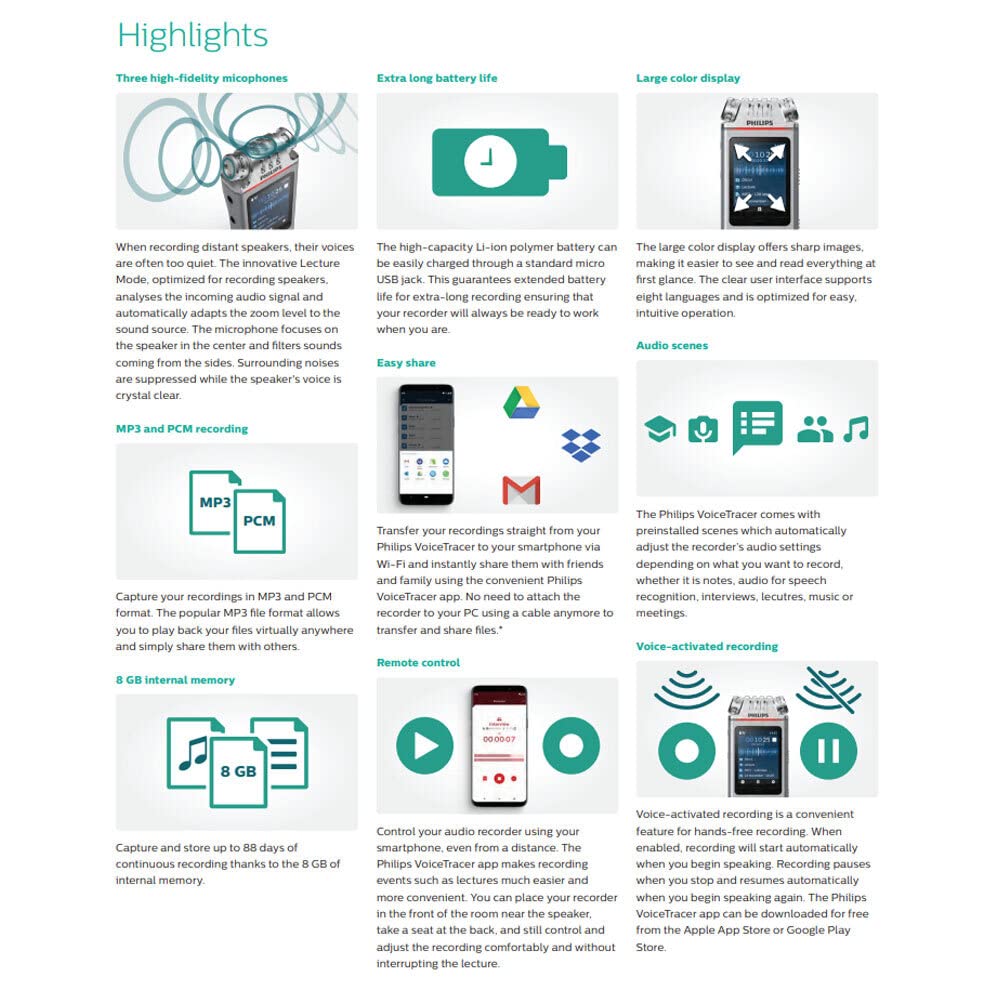 Q: What are the key features of the Philips DVT4110 Voicetracer Digital?A: The Philips DVT4110 Voicetracer Digital features 3 high-fidelity microphones for exceptional audio clarity, stereo recording in both MP3 and PCM formats, a free remote control and sharing app for easy file management, 8 GB of built-in memory with a memory card slot for expansion, and a powerful Li-Ion rechargeable battery.