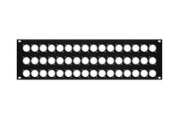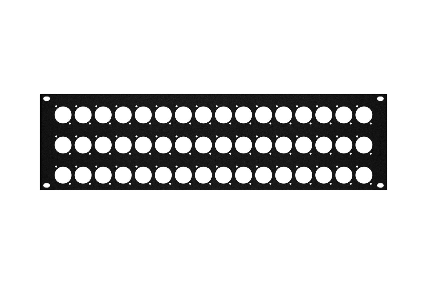 Elite Core Rp3U-48D Is A 3 Rack Space Metal Panel With 48 D-Series Punch Outs Evenly Spaced In 3 Rows Of 16 In Black Powdercoat Finish. Holes Are Slightly Offset Toward The Bottom For Labeling.