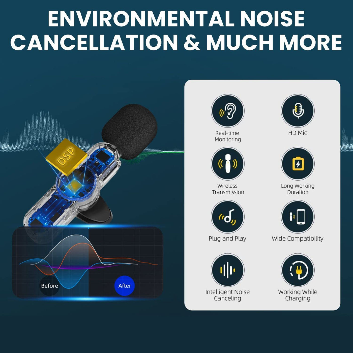 Mcvem Dual Wireless Lavalier Lapel Microphone For Iphone, Android, Camera 2 Cordless Mics Plug And Play 2.4G Noise Reduction Chi