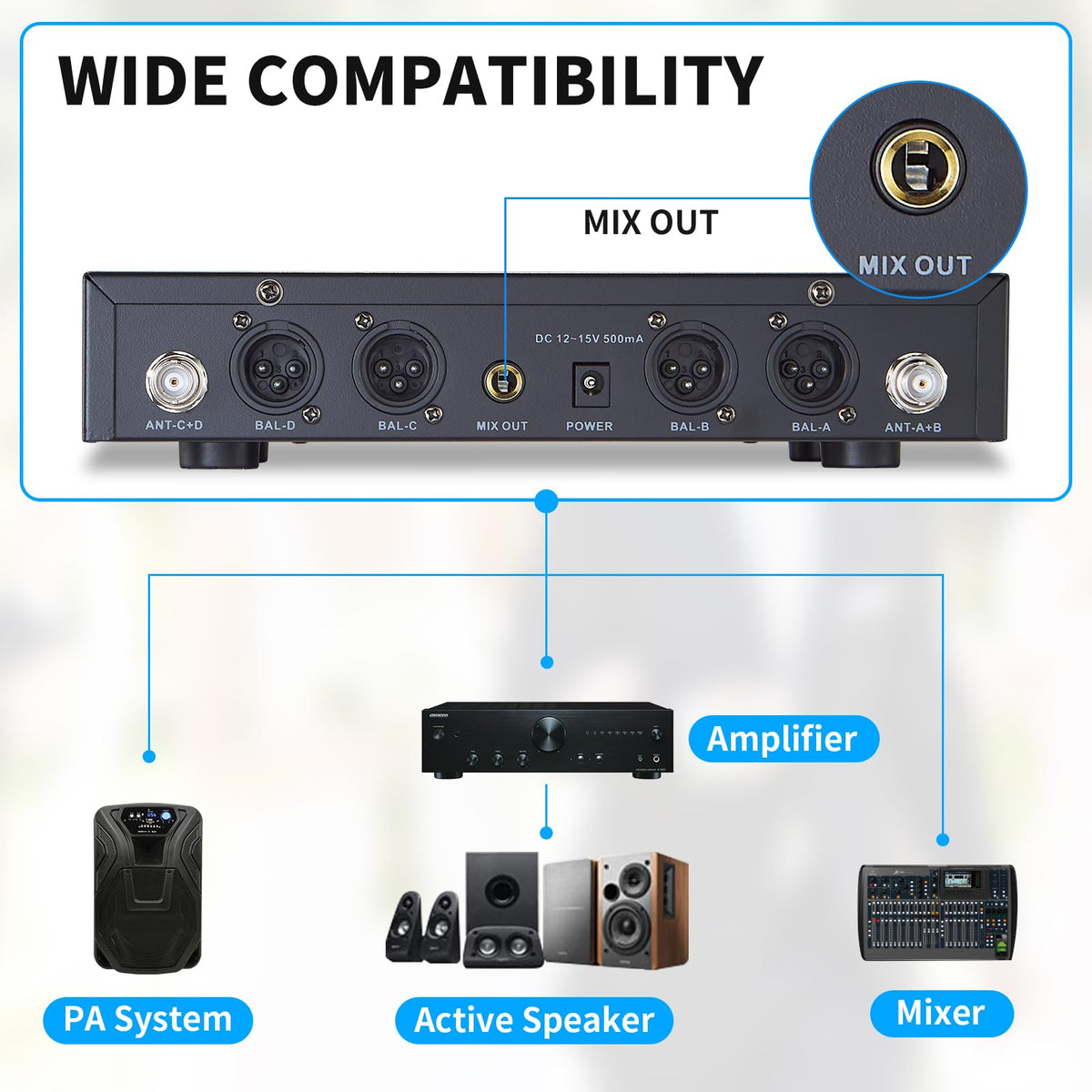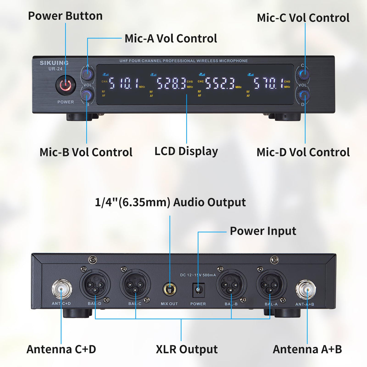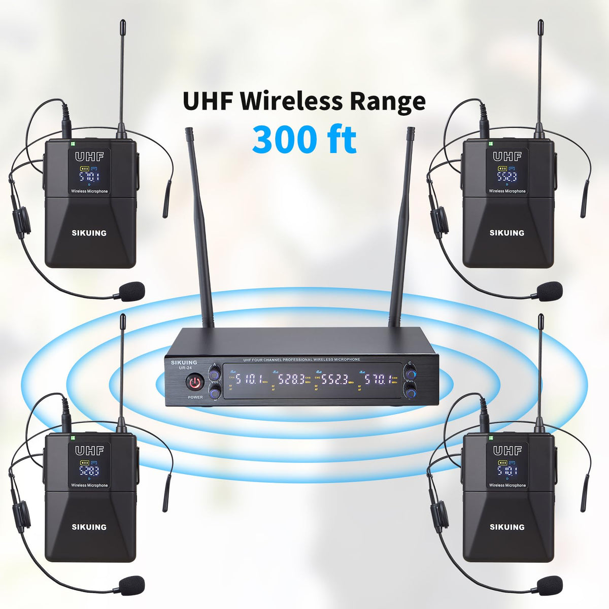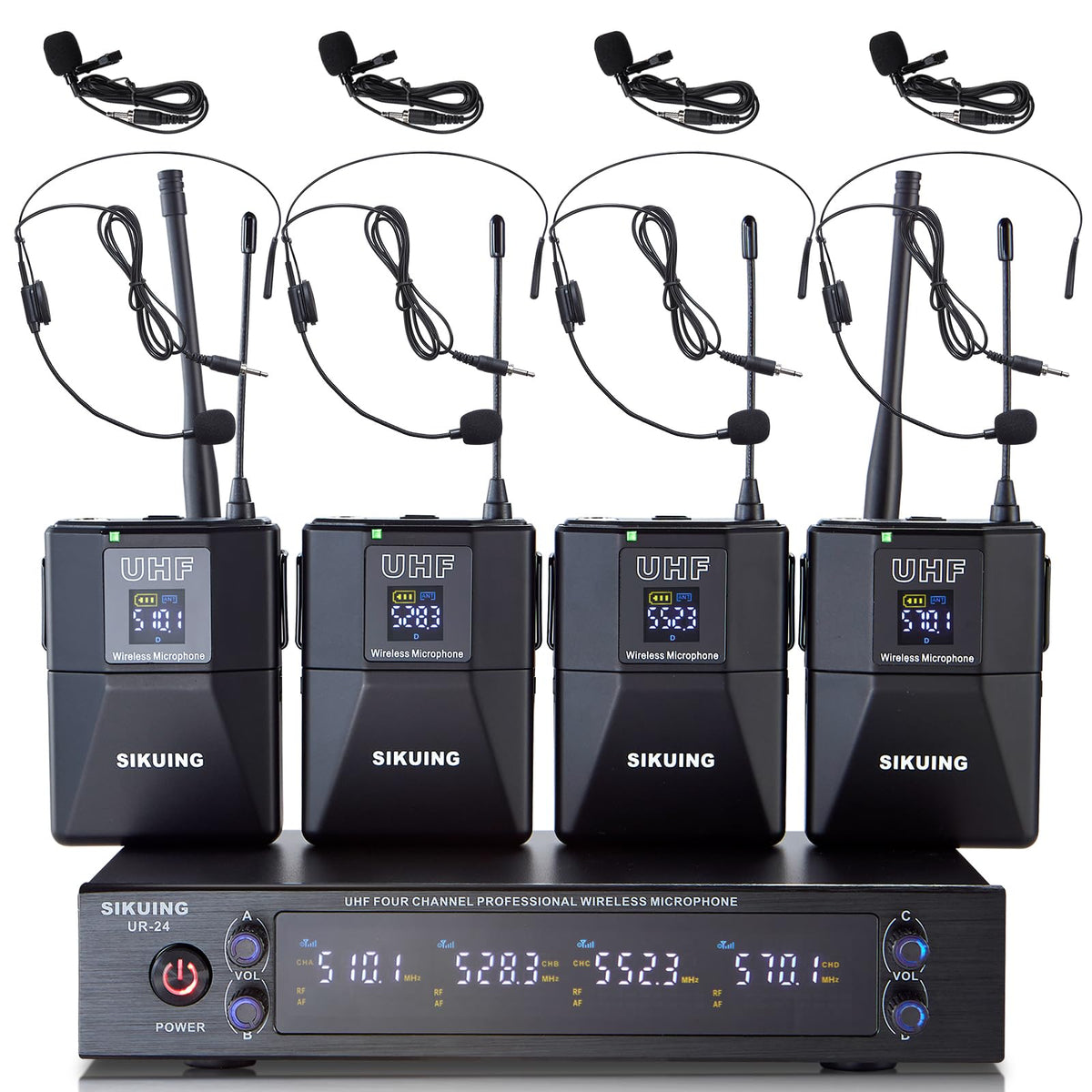 Sikuing 4 Channel Uhf Wireless Microphone System With Cordless Handheld Lavalier Headset Mics, 4X50 Adjustable Frequencies, Ideal For Karaoke Meeting Church, 300Ft Range