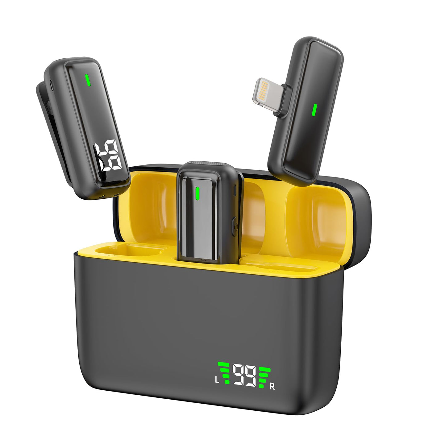 iPhone microphone , 2 pack wireless lavalier microphones cordless consist of 2 mics, 1 receiver, 1 charging case . Firstly, our dual wireless lapel microphones is plug and play and easy to use. Iphone lapel mic wireless iphone lightning lavalier mic iphone microphone iphone mics for recording The lovably tiny clip-on mic is easy to carry and keep. Plus, our ipad dual cordless lav mic effortlessly picks up the ambient sound while reducing background noise as it is empowered with DPS automatic noise cancellation. Its professional design of cordless bluetooth mic makes it possible to function at a long distance of 70 feet, making it more versatile and handy for multiple scenarios. Last but not least, bluetooth lavalier mic save you the trouble of downloading app and hassle of setting, and the cordless lapel mic is universally compatible with iPhone, iPad, and with the help of adapter.