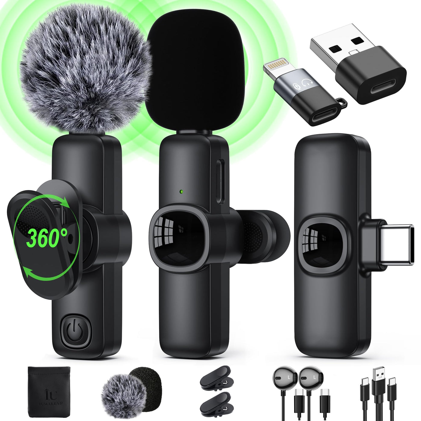 Professional Plug and Play Wirelesses Lavalier Microphone- Compatible with iPhone/iPad/Android/Laptop/PC.Why choose IUMAKEVP Clip On Lapel Microphone?Choose our benefits:Plug and play, no APP or Bluetooth required.Wide compatibility, suitable for most phones/tablets with Type-C/Lightning/USB-A interface.100 ft wireless transmission range, get rid of wired limitations.2 mics and 1 receiver, can record two sound sources at the same time,also use either mic alone.Comes with a type-C port wired earphone for real-time monitoring,reducing post-editing time.Built-in DSP IC chip, effectively filter noise, 360 omnidirectionalultra-clear sound pickup, make the sound clearer.Fully charged in just 1.5 hours and works for up to 8 hours.The receiver has an additional Type-C port that supportscharging your phone while recording.Small and lightweight, the lapel mic total weighs only 0.2 lbs.Easily clip it to your shirt or collar.Comes with a leather storage bag for easy storage and carrying.Designed for Live Streamers, Online Educators, Interviewers, YouTubers,TikTok Creators, Vloggers, Bloggers and Other Video Recording Lovers.How to use IUMAKEVP Wireless Clip Mic?1. Plug the receiver into your device.2. Turn on the switch of the microphone and it will be paired automatically.3. The microphone s indicator light stays on green (successful pairing).How do I use other modes?Mute Mode: Click the transmitter power button once to switch to the mute stateand the green light will flash. Click again to unmute and the green light will stay on.Reverberation Function: Click the power button twice in a row to turn onthe reverb, the green light is first red and then green. Click twice in a rowagain to turn off the reverb, the green light is on.Shut Down: Press and hold the power button for 3 seconds.Add to cart now!!!
