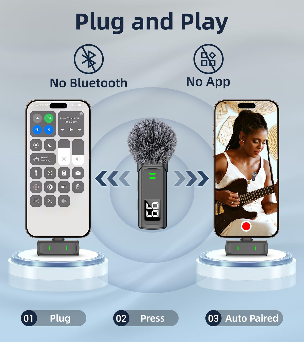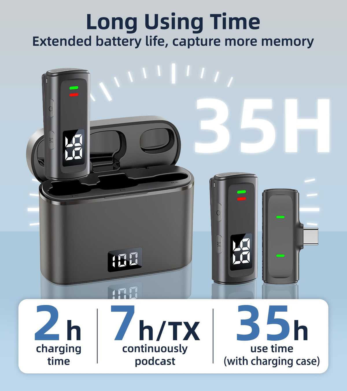 Ezcoloris Wireless Lavalier Microphone For Iphone - Tiny Lapel Microphone Usb C -The Microphone With Intuitive Battery Display Screen, Easy To Tell The Battery Power From 1%-100% -Custom-Made Deadcat Cap Help To Reduce Noise, Enjoy Clear Voice Recording Even On Windy Outdoor -Extended Working Time With Battery Case, Full Charged, This Wireless Microphone Can Work Up 35Hours, Never Worry Power -Plus A Sturdy Carrying Case Keeps Microphones And Accessories Organized And Protected For Convenient Video Recording Anytime, Anywhere -Built-In Anc Noise Canceling Chip And Omini-Directional Condenser Microphone With Cvc Tech, Easy To Provide Clear Audio For Your Video, Podcast, Youtube, Tiktok Creation -Mute Function, Help To Protect Your Private Talking During Live Streaming -With Original Sound Mode, The Microphones Deliver Exceptional Audio Quality, Making It The Top Choice For Professional Sound Editing Wireless Microphone Features -Up To 75Ft Long Range Transmission -Microphone Wireless Quick Connection, Auto Pairing In Seconds, No Settings, No Bluetooth, No Cables -S/N Ratio: 75Db -Delay:Less Than 20Ms -2 Pcs Microphones, Ideal For Interviews -Small And Lightweight, Clip On Shirt To Podcast Naturally