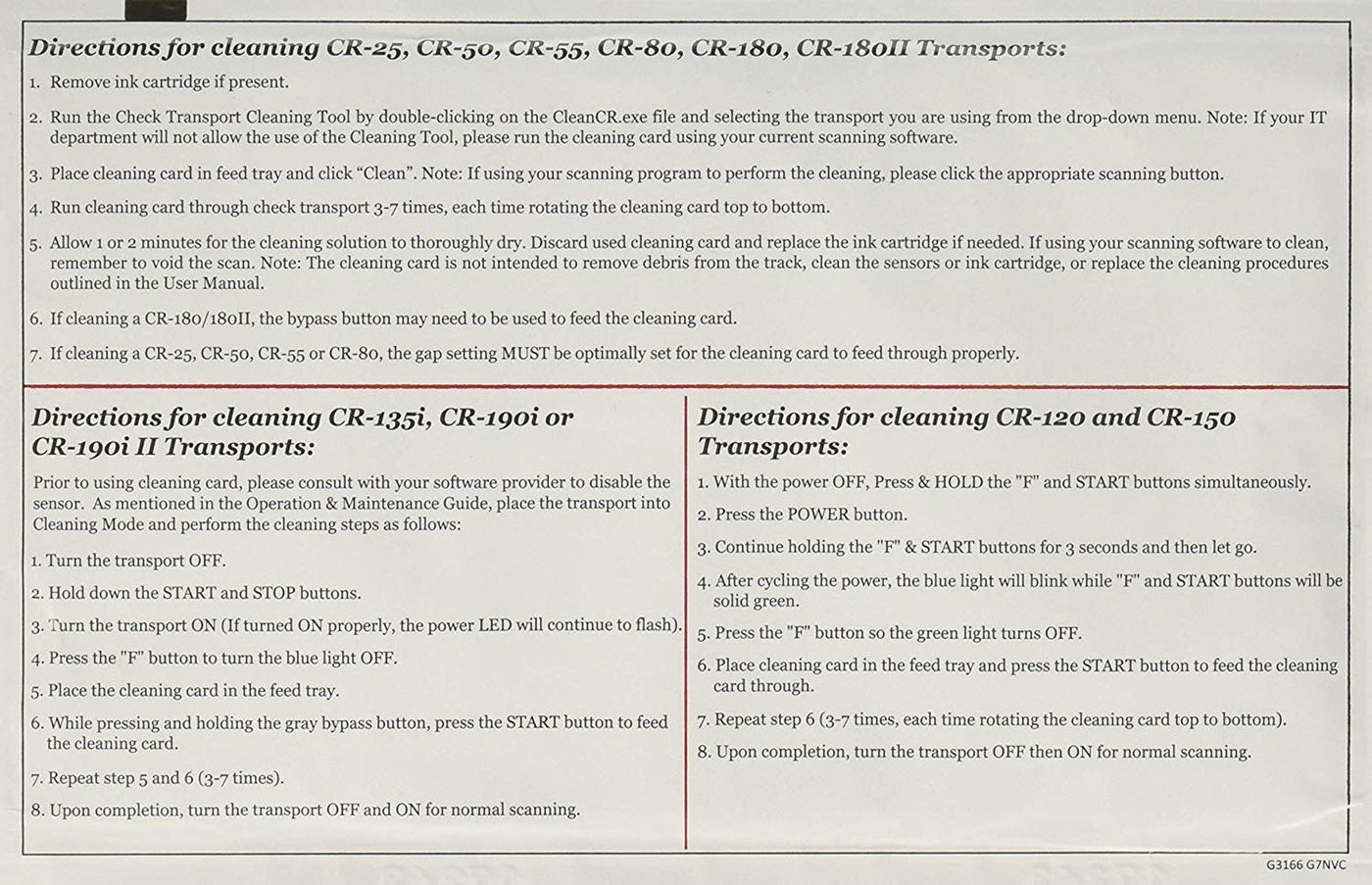 Q: Which Canon check scanner models are compatible with these cleaning cards?A: These cleaning cards are compatible with Canon check transport models CR-25, CR-55, CR-135i, CR-180, CR-180ii, and CR-190, making them an ideal choice for maintaining these specific models.