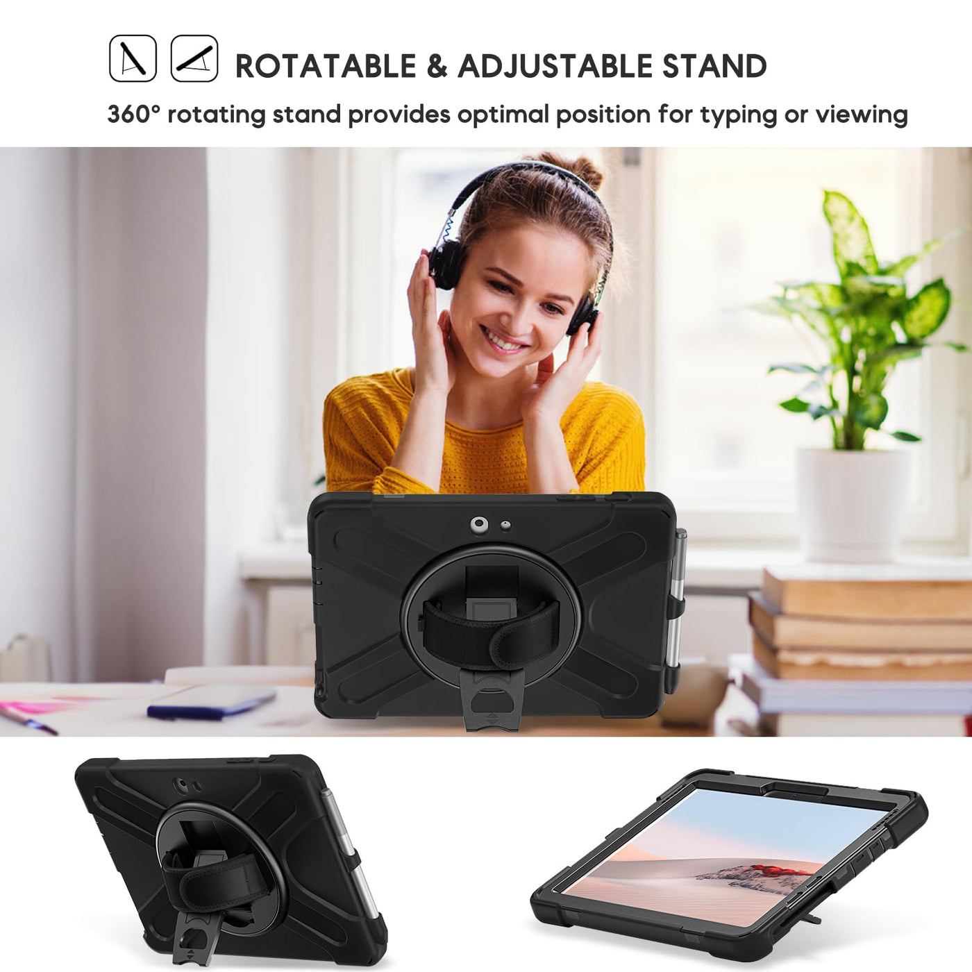 17 Years Experience On Tablet Case Research And Manufacturing. We Provided The Strongest Tablet Case! Compatibility The Case Only Fits For Microsoft Surface Go 3 10.5 Inch 2021 / Surface Go 2 10.5 Inch 2020 / Surface Go 10 Inch 2018 Tablet Precise Cutouts Precise Cutouts Allow Full Access To All Features (Buttons, Speakers, Cameras,Charging Port). Adjustable Hand Strap You Can Adjust The Tightness Of Your Hand Strap To Hold The Tablet With One Hand Securely. Multi-Angle Kickstand The 360 Degree Rotating Kickstand Allows For All Direction Viewing Or Playing. Removable Shoulder Strap Attach Strap To Any Two Holes To Carry Your Device Vertically Or Horizontally Like A Messenger Bag / Neck Bag / Sling / Harness Or Holster. Allows You To Display Your Tablet Behind One Seat For Personal Viewing Or Between Two Seats For Shared Viewing. Shockproof Protective Material Combined With Durable Pc And Shock-Absorbing Tpu Material, 3 Layers Heavy Duty Case Offers Maximum Protection Against Drops, Bumps And Shock. Using Reinforced Protectors At The Shell'S Four Corners, The Tablet Will Be Unbreakable From All But The Most Extreme Drops. Easy To Install And Remove. Dust Protection Covers For Each Port Prevents Much Dust From Getting Into Tablet Charge Port Or Others. Water Resistant Special Paintcoat Is Adopted On Our Soft Silicone Outer To Gain Comfortable Hand Feeling, And Prevent From Rain And Dust Sticking. Which Meaning Waterproof For Rainy Days Or Small Splashing. It Can Not Be Used Underwater, Such As Swimming, Diving Etc. Package Included 1 X Microsoft Surface Go 3 10.5 Inch 2021 / Surface Go 2 10.5 Inch 2020 / Surface Go 10 Inch 2018 Tablet Case 1 X Manual (Installing Guidance) 1 X 360 Degree Rotating Stand 1 X Adjustable Handle Hand Strap 1 X Detachable & Removable Shoulder Strap