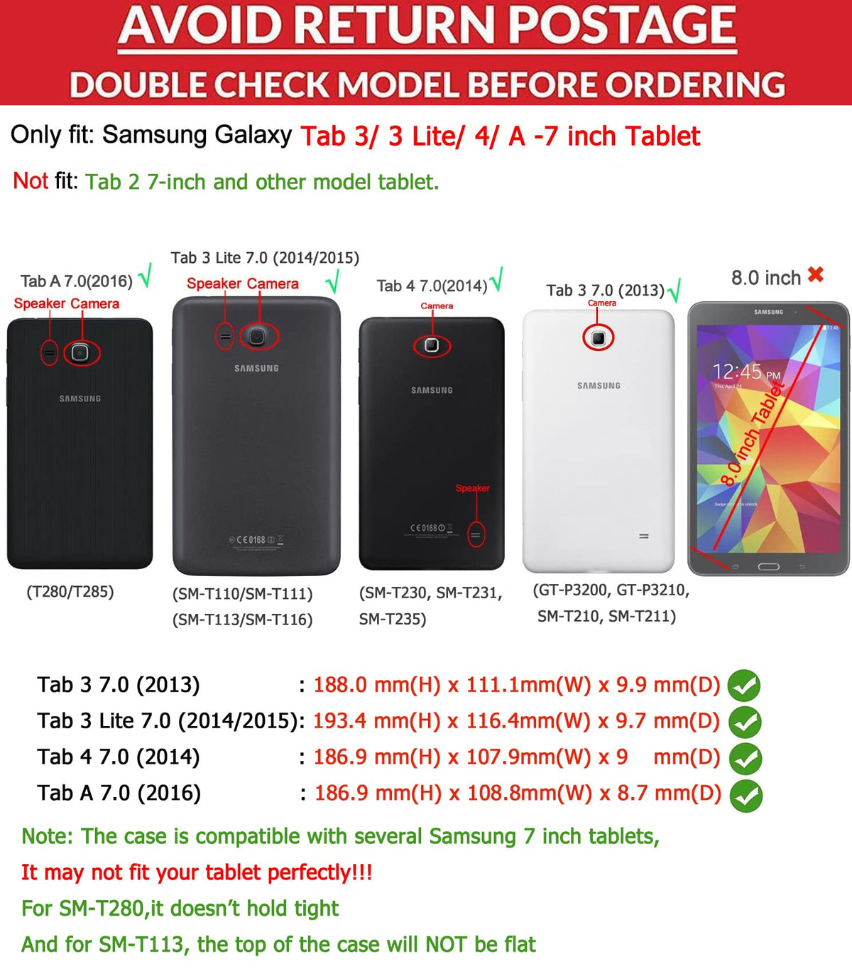 Compitable With: Samsung Galaxy Tab A 7.0 Inch 2016 Release Tablet (Sm-T280,Sm-T285) Samsung Galaxy Tab 3 7.0 (Gt-P3200, Gt-P3210, Sm-T210, Sm-T211) Samsung Galaxy Tab 3 Lite 7.0 (Sm-T110,Sm-T111,Sm-T113,Sm-T116) Samsung Galaxy Tab 4 7.0 Inch (T230,T231,T235) Only