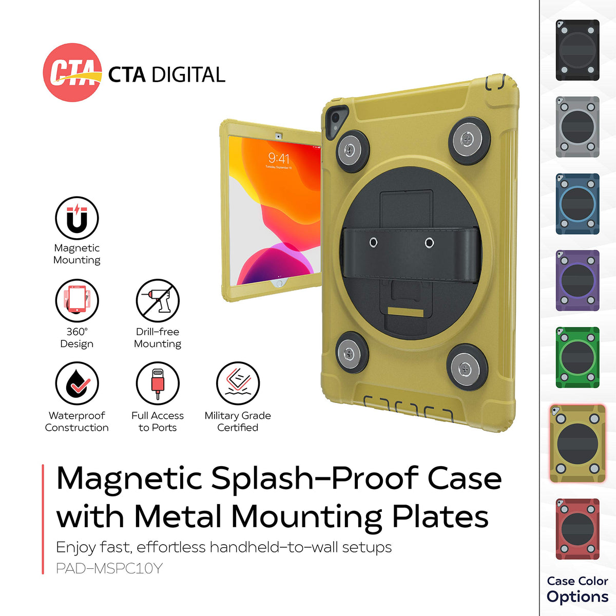 'Enjoy Fast, Effortless Handheld-To-Wall Setups With Cta Digitals Magnetic Splash-Proof Case For Ipad. This Rugged Tablet Case Employs Powerful Embedded Magnets At Its Rear To Enable Instant Mounting To Metal Surfaces. Your Tablet Will Be Easily Accessible On The Wall Of Any Kitchen, Garage, Engine Room, Or Even Just The Front Of The Fridge In Your Kitchen. No Metal Wall To Fix It To? No Problem: Also Included Are Magnetic Mounting Plates, One Large And Two Small, Plus Adhesive Mounting Strips, So That You Can Create Fast, Drill-Free Magnetic Surfaces For Your Tablet Anywhere You Like. The Splash-Proof, Impact Resistant Case Is Designed To Allow Full Access To Your Tablets Ports, Speakers, And Home Button. The Magnetic Splash-Proof Case Is Compatible With Ipad 7Th Gen 10.2 , Ipad Air 3 & Ipad Pro 10.5'' Features: Water-Resistant Design Military Grade Certified (Mil-Std-810G) Silicone Case & Screen Protector Can Be Wiped With Sanitizing Wipes Screen Protector Durable Impact Shielding Full Access To Charge Port, Speakers, And Home Button Embedded Magnets On Case Rear Allow Quick Mounting To Any Metal Surface 2 Sizes Of Metal Plates With Adhesive Backing For Fast Mounting Setups Anywhere Perfect For Refrigerators, File Cabinets, Classroom Walls, And More Compatible With Ipad 7Th Gen 10.2 , Ipad Air 3 & Ipad Pro 10.5'' Specifications: Dimensions: 10.25 X 7.75 X 1 Weight: 1.5 Lbs. Package Contents: (1) Rugged Case (1) Large Metal Mounting Plate (2) Small Metal Mounting Plates''