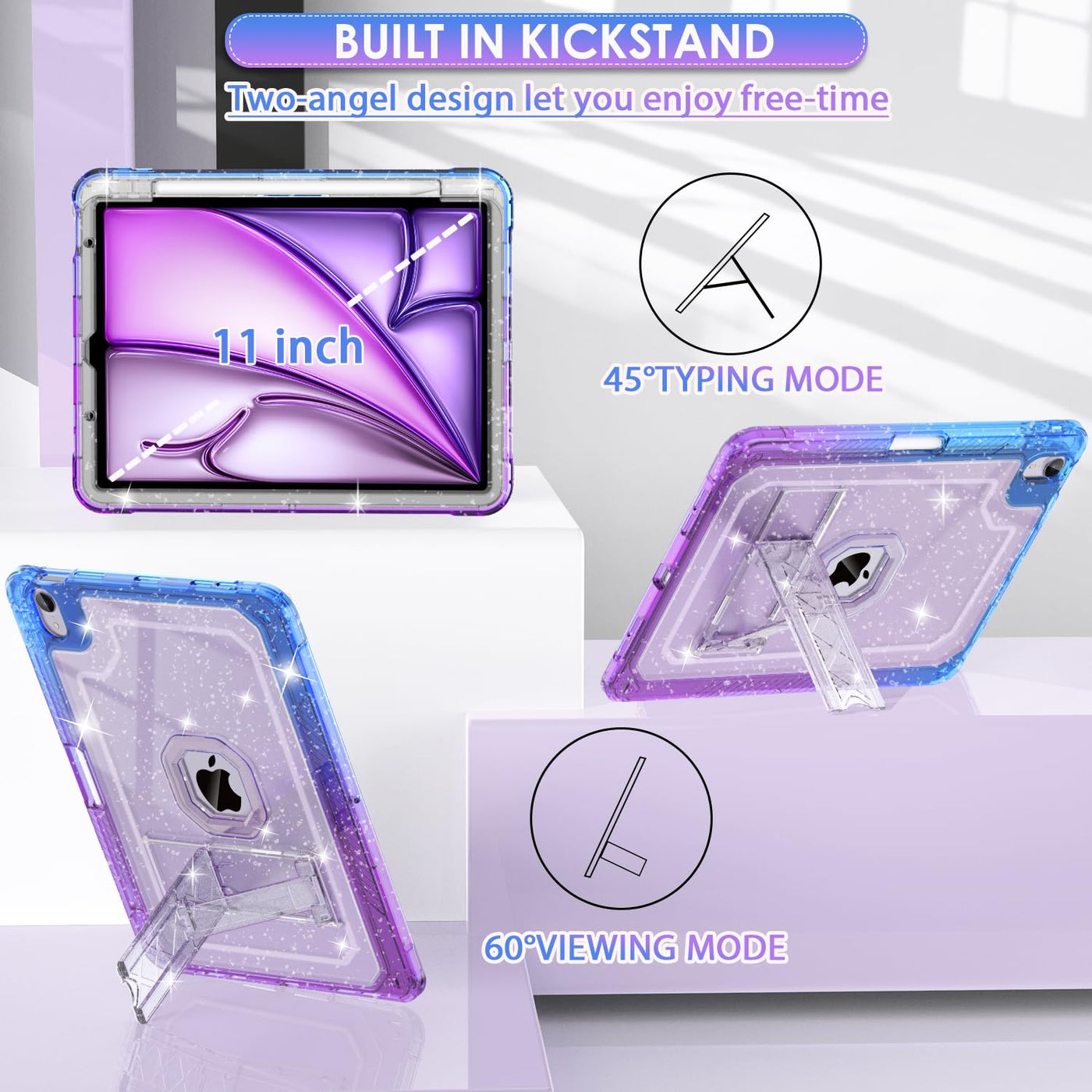 Zonefoker For Ipad Air 6Th 11 Inch M2 Generation Case 2024, Ipad 5Th/4Th 11-Inch 2022/2020, Purple Blue Glitter Slim Cover With Pencil Holder Heavy Duty Shockproof Protective Case With Kickstand For Kids