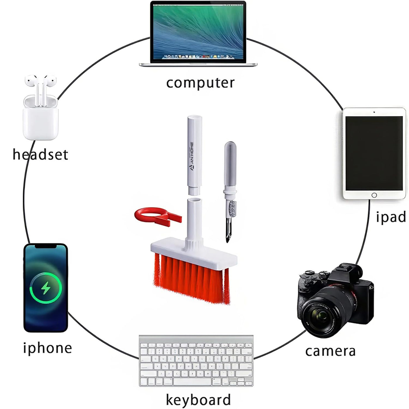 Q: What devices can I clean with the AnHome 5-in-1 Keyboard Cleaning Kit?A: The AnHome 5-in-1 Keyboard Cleaning Kit is versatile and can effectively clean a variety of electronic devices, including mobile phones, charging cases, Bluetooth earphones, keyboards, laptops, cameras, printers, and other home and office appliances.
