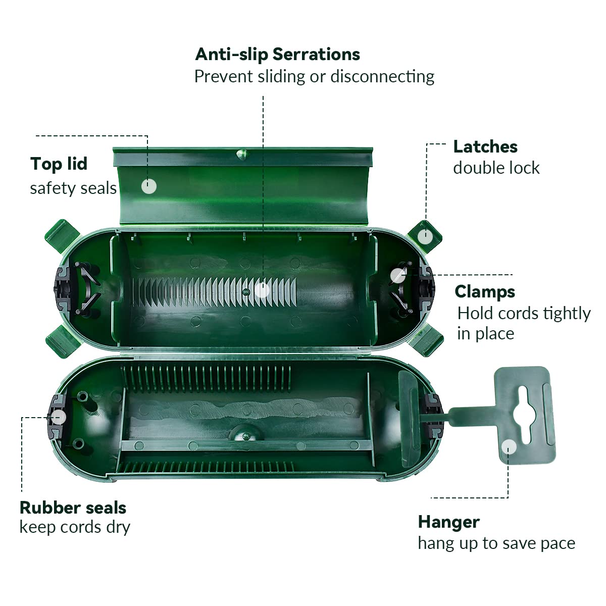 Weatherproof Electrical Connection Box,Outdoor Rain-Proof Plug Cover,Outdoor Extension Cord Cover, Twist And Seal Cord Protector Made Of High-Quality Pp Material, The Plug Cover Is Sealed With Rubber At Both Ends, Which Is Snow-Proof, Rain-Proof, And Can Protect The Normal Operation Of The Circuit, Ideal For Outdoor And Indoor Use. The Outer Shell Allows Water To Slide Off The Surface To Reduce The Rain Water Flowing Into The Wire; It Also Has A Double Closing Design To Ensure That The Protector Cannot Be Easily Opened; The Inside Of The Protector Is Designed With A Card Slot, Which Can Fix The Wire Well Without Moving Easily. Each Extension Cord Connection Cover Measures Approx. 8.25 X 2.75 X 2.75 Inches, Compatible With 12/14/16 Extension Cord And Flat Cable; Slide To Adjust The Position Of The Limiter For Different Lengths Of Connections. Specifications: Material: Pp Plastic Color: Green Size: About 8.25 X 2.75 X 2.75 Inches Quantity: 2 Pieces Package Includes: 2 X Outdoor Extension Cord Cover