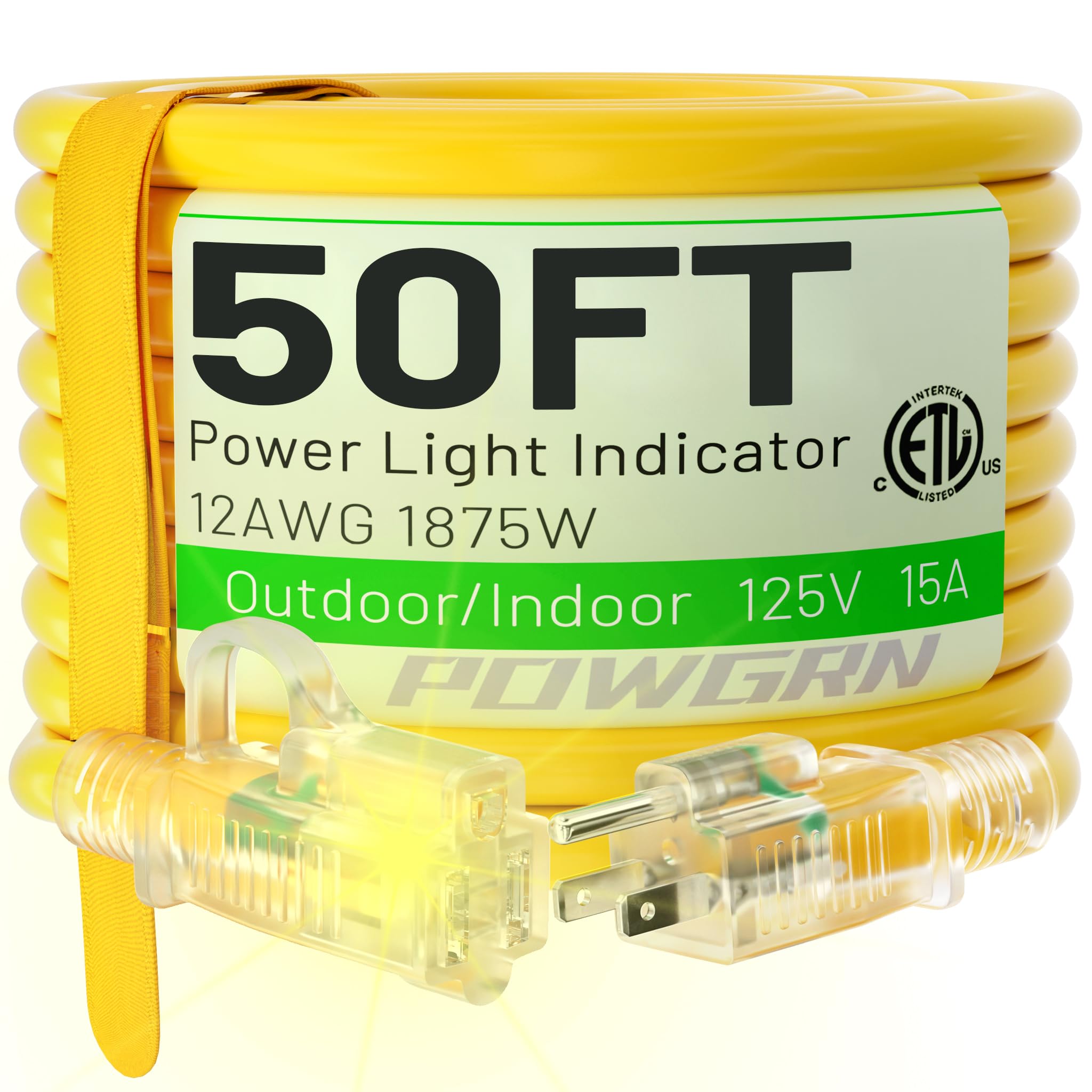 Specification 50Ft Outdoor Extension Cord 12 Gauge With 3 Prong 15 Amp, 125 Volts, 1875Watts Male Power Plug Nema 5-15P, Female Power Socket Nema 5-15R Sjtw Weatherproof Extension Cord Outdoor, Etlcetl Listed Multipurpose Heavy Duty Extension Cord 50 Ft Is Perfect For Any Heavy Duty Use: Circular Saws, String Lights, Block Heater, Lawn Mowers, Gardening, Landscaping, Construction Site, Welding Work, Or Powering Major Appliances Lighted End & Safe To Use Led Indicator Lights Up When Extension Cord Powered, Bright Pvc Jacket Color Makes This Power Cord Extension Easily Visible Outdoor And Indoor, Avoid Tripping In Dark Work Environment Each Power Extension Cord Oudoor 123 Passed 1500V High Voltage Test To Keep Your Appliance In Safe Weather-Proof & Flexible Extension Cords Jacket Is Wear-Resistant And Durable, 3 Prong Extension Cord 50 Foot Is Ip65 Waterproof, Weather- Resistant, Heat-Resistant (158Af), Corrosion-Resistant, Flexible Vinyl Indoor Extension Cord 50 Feet Will Keep Flexible At -58Af And Easy Re-Pack After Using Hook & Strain Relief Design Appliance Extension Cord Plug And Socket End Have A Strain Relief Design, Which Is Not Easy To Break When Bent And Used The Socket Has A Hook Design, Which Is Easy To Plug And Unplug And Can Be Hung In A Humid Environment, Making 12 Gauge Extension Cord Safer To Use Warranty Package Contains 50 Ft Extension Cord And Storage Straps, Free Friendly And Reliable Customer Service Will Respond To You Within 24 Hours You Will Get 30-Day Return And 12-Month Replacement