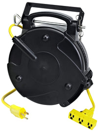 Heavy Duty Industrial Retractable Extension Cord Reel W/ Tri-Tap And Circuit Breaker Product Description Alert 8150M-P 50 Ft Sjtow Cold Weather Cord 50 Ft Heavy-Duty Industrial Grade Thermos Plastic Reel Tri-Tap Power Block W/ 3 Grounded Outlets Resettable Circuit Breaker Built Into Tri-Tap Quick Release Steel Mounting Bracket With Convenient Carrying Handle Color Box Smooth 2 Roller Cable Movement (Pullout And Retraction) Note: If Circuit Breaker Trips, Remove Overload And Wait Two Minutes Before Resetting Breaker By Pushing Reset Button. Additional Information Cord Type Sjtow Cold Weather Cord Gauge 14/3 Cord Length 50 Ft. Total Max. Rating 1625 W, 13 A, 125 V Max. Power 1625 W Max. Current 13 A Max. Voltage 125 V No. Of Outlets 3 Nema 5-15R Upc Code Upc 0-40082-43072-2 Listings Cetlus Warning: To Avoid Serious Injury Or Death From Electrical Shock Or Fire. 1. Do Not Handle This Fixture Or Try To Plug It In When Your Hands Are Wet Or Damp Or When You Are Standing On A Wet Or Damp Surface Or In Water. 2. This Fixture Must Always Be Used In Accordance With All Electrical And Safety Codes And Ordinances, Including The Most Recent National Electric Code (Nec) And With The Occupational Safety And Health Act (Osha) Volume 1 On General Industry Standards And Interpretations. 3. Always Make Certain That The Power Source Conforms To The Requirements On The Fixture. 4. Always Disconnect The Power Before Servicing Or Inspecting The Fixture For Any Reason. 5. This Fixture Is Only For Use On 110-125V And Is Equipped With An Approved 3 Conductor Cord With A 3-Prong, Grounded Plug. To Reduce The Risk Of Electrical Shock, It Should Only Be Plugged Into A Properly Grounded 3-Prong Outlet. 6. This Fixture Comes Equipped With A 3-Prong Grounded Plug. Do Not Remove The 3Rd Prong Or Otherwise Try To Modify The Plug.