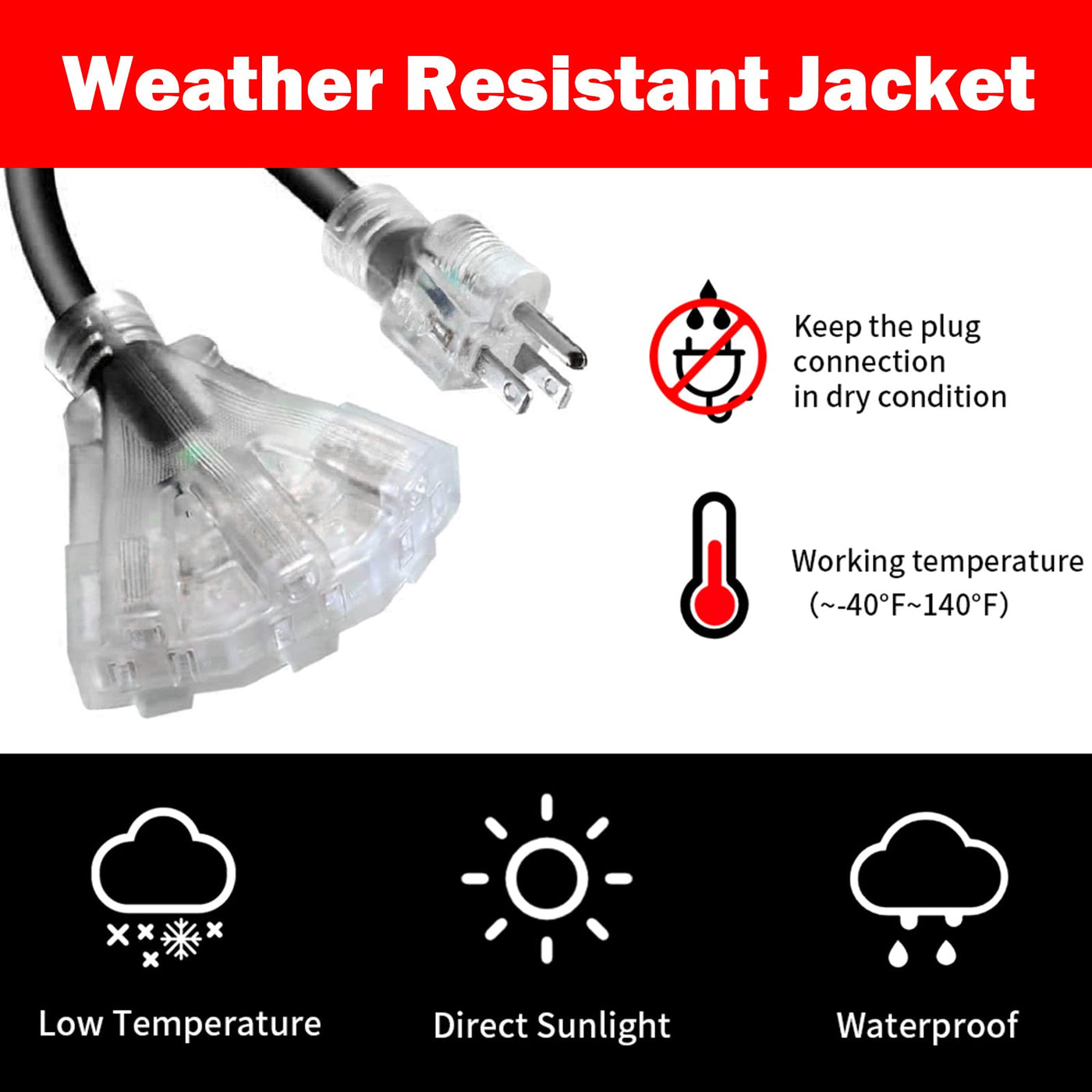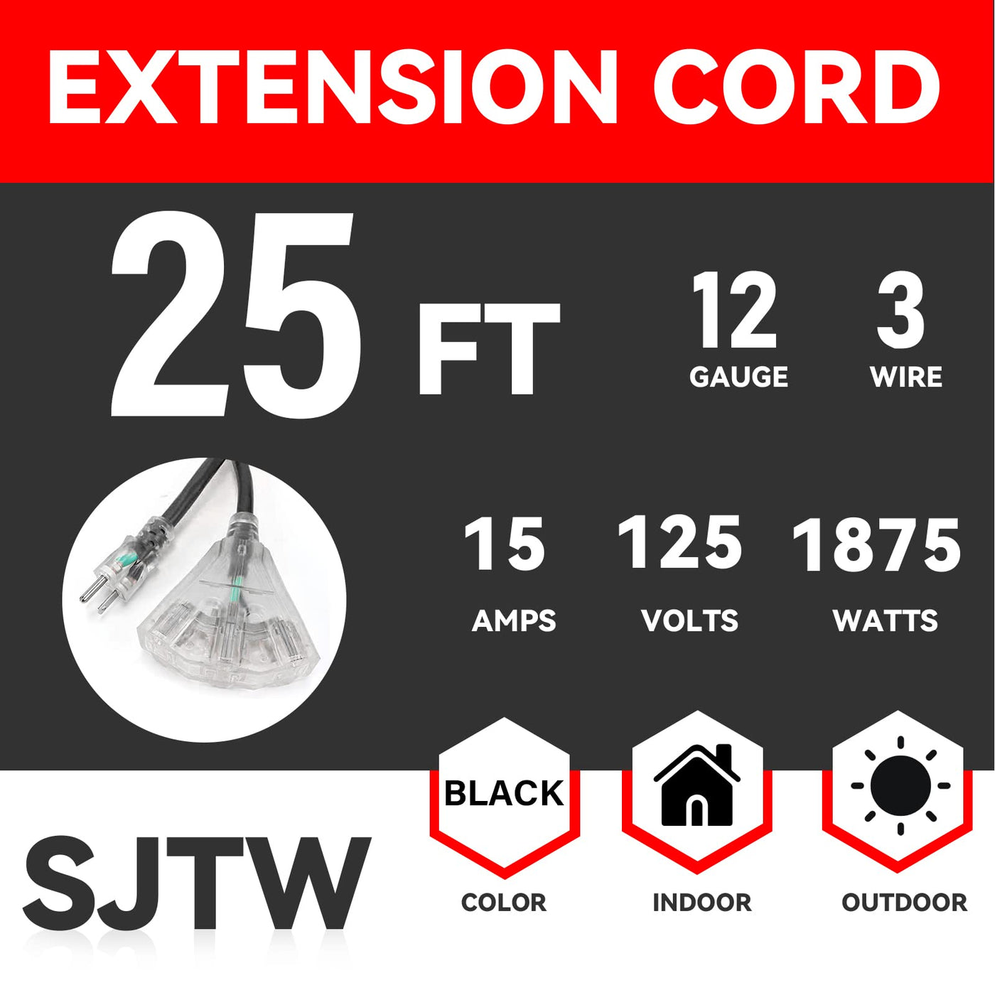 Ep 25 Ft Lighted Outdoor Extension Cord With 3 Electrical Power Outlets 12/3 Sjtw Heavy Duty Black Extension Cable With 3 Pron
