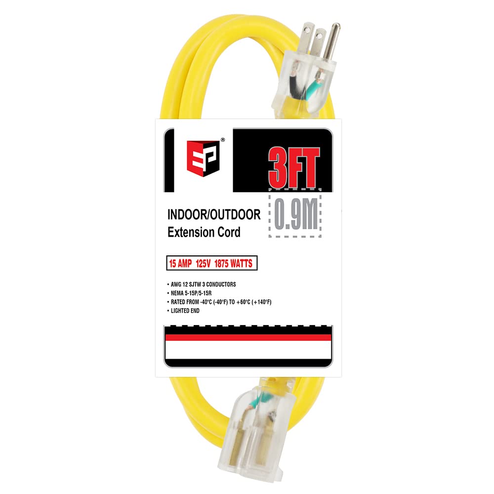 Ep 3 Ft Lighted Outdoor Extension Cord 12/3 Sjtw Heavy Duty Yellow Extension Cable With 3 Prong Grounded Plug 15Amp Power Co