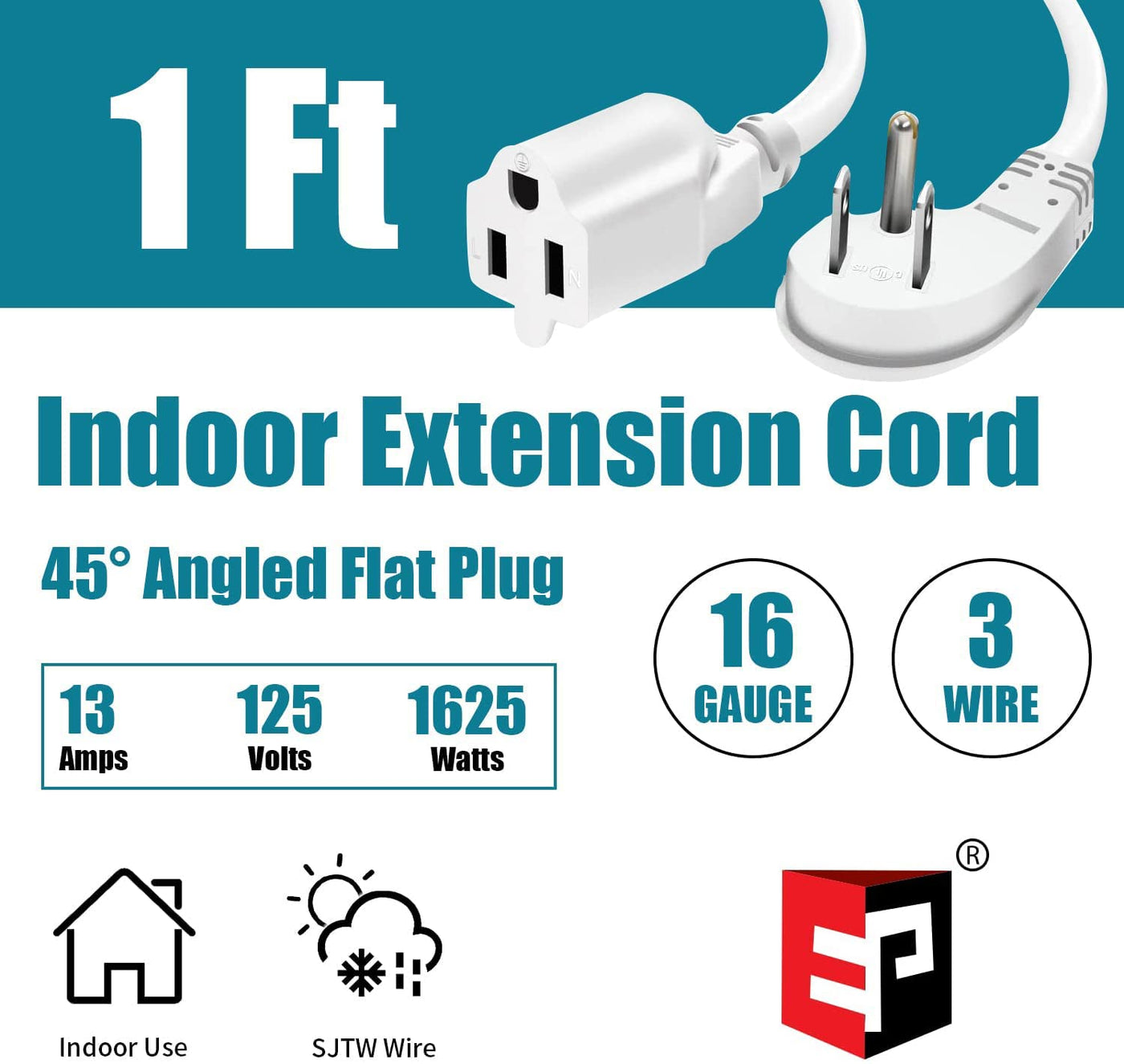 Ep 1 Ft Extension Cord With Angled Flat Plugep Extension Cord Is Perfect For Different Distance Usesdesigned With A Flat Plugmade From High Quality Ul Listed Approved Material, No Smellspecification Rating: 125V13A,1625W Length: 1Ft3Ft6Ft10Ft15Ft25Ft Cord: Sjtw 163 Gauge Package List1Ft Flat Extension Cord X 3 Important Notes -This Power Cord Is For Indooroutdoor Use,Make Sure The Connections Are Not Immersed In Water -Check The Voltage And Amp Rating Of Your Equipment To Ensure Compatibility