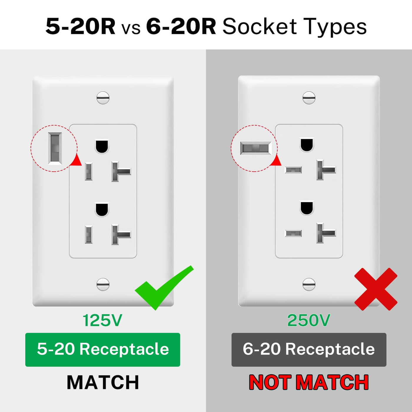 Q: What type of connections does this extension cord support?A: This extension cord is designed for NEMA 5-20P to 5-20R connections. Please ensure your plug type matches before purchase, as it is not compatible with NEMA 6-20 (250V) outlets.