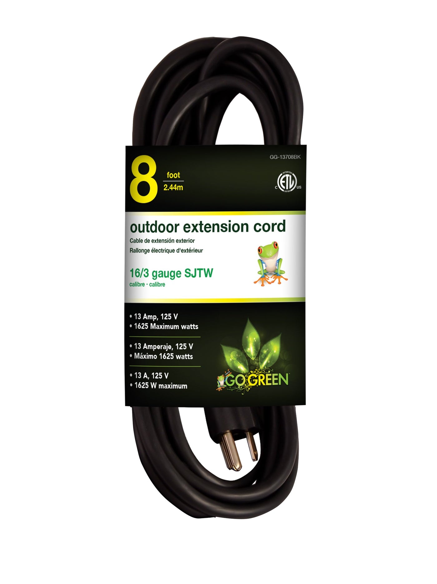 Go Green Power Inc. (Gg 13708Bk) 16/3 Sjtw Outdoor Extension Cord, Black, 8 Ft