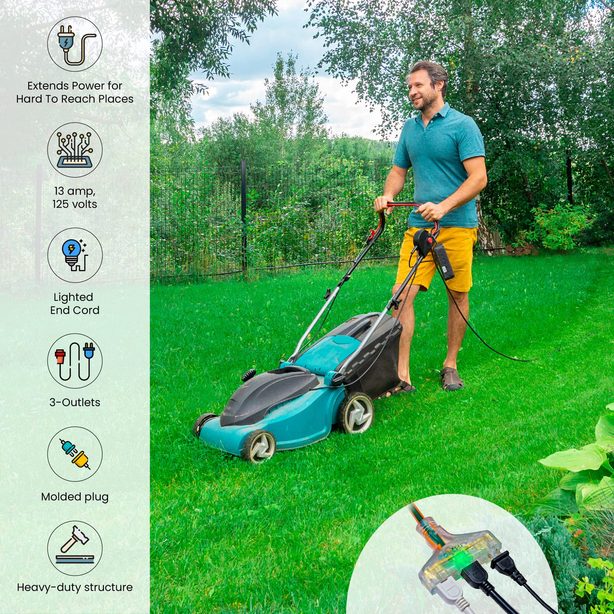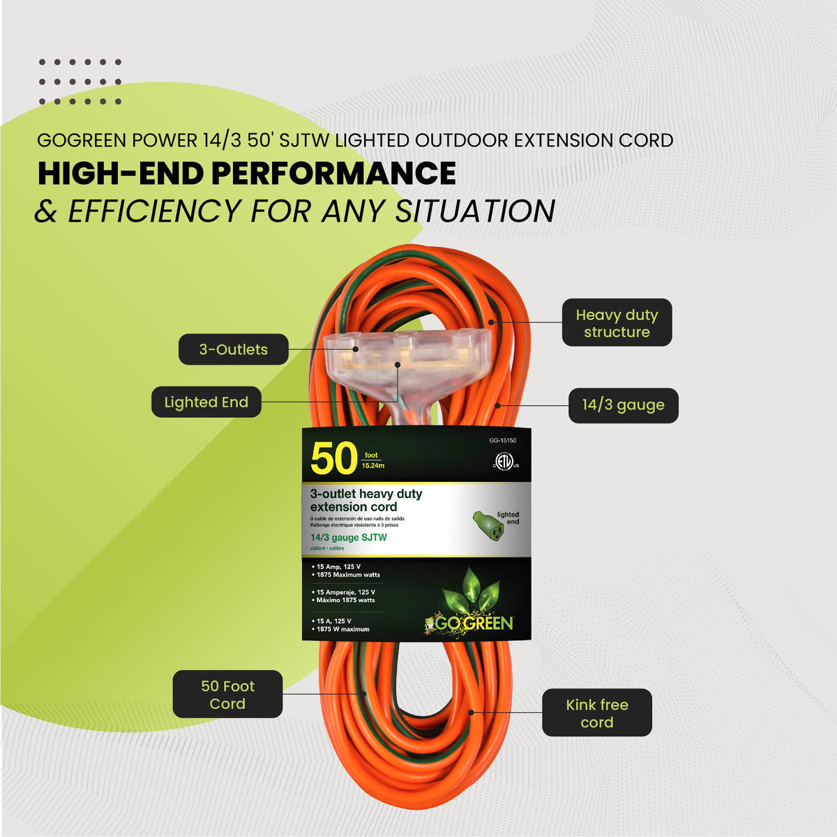When The Going Gets Tough, The Tough Gets Going, And The Gogreen Power (Gg-15150) Lives Up To That! The Robust And Durable, Contractor Grade 14/3 Sjtw 3-Outlet Extension Cord Is Ready To Rumble, Both Indoors As Well As Outdoors. Being Moisture Resistant, Abrasion Resistant, And Durable, Even With Prolonged Exposure To Sunlight, This Cord Is Cetl Listed And Certified, Which Is Compliant With The Rigorous Standards For A Hard Service Thermoplastic Cable Rated For 125 Volts.Our Heavy Duty Extension Cord Has Molded Plugs Which Gives It A Sturdy Build And Makes It Easy To Use. And What Could Be More Convenient Than Merely Seeing If The Cord Is Working Or Not, Since This Item Has A Lighted End To Show The Power Is On. The Kink Free Cord Is Recommended For Use With Heavy Duty Equipment And Tools, With A Maximum Of 15 Amps, 1875 Watts And 125 Volts.By Purchasing This 3-Outlet Extension Cord, You Not Only Will Get A High-Quality Product; But Also Get Ecological Peace Of Mind With Hassle-Free Recycling. We Offer Free Recycling And Free Shipping Back Of The Used Product To Our Recycling Facility. Please View The Recycling Code And Instructions On The Back Of The Package And Visit The Gogreen Power Website For Additional Information.
