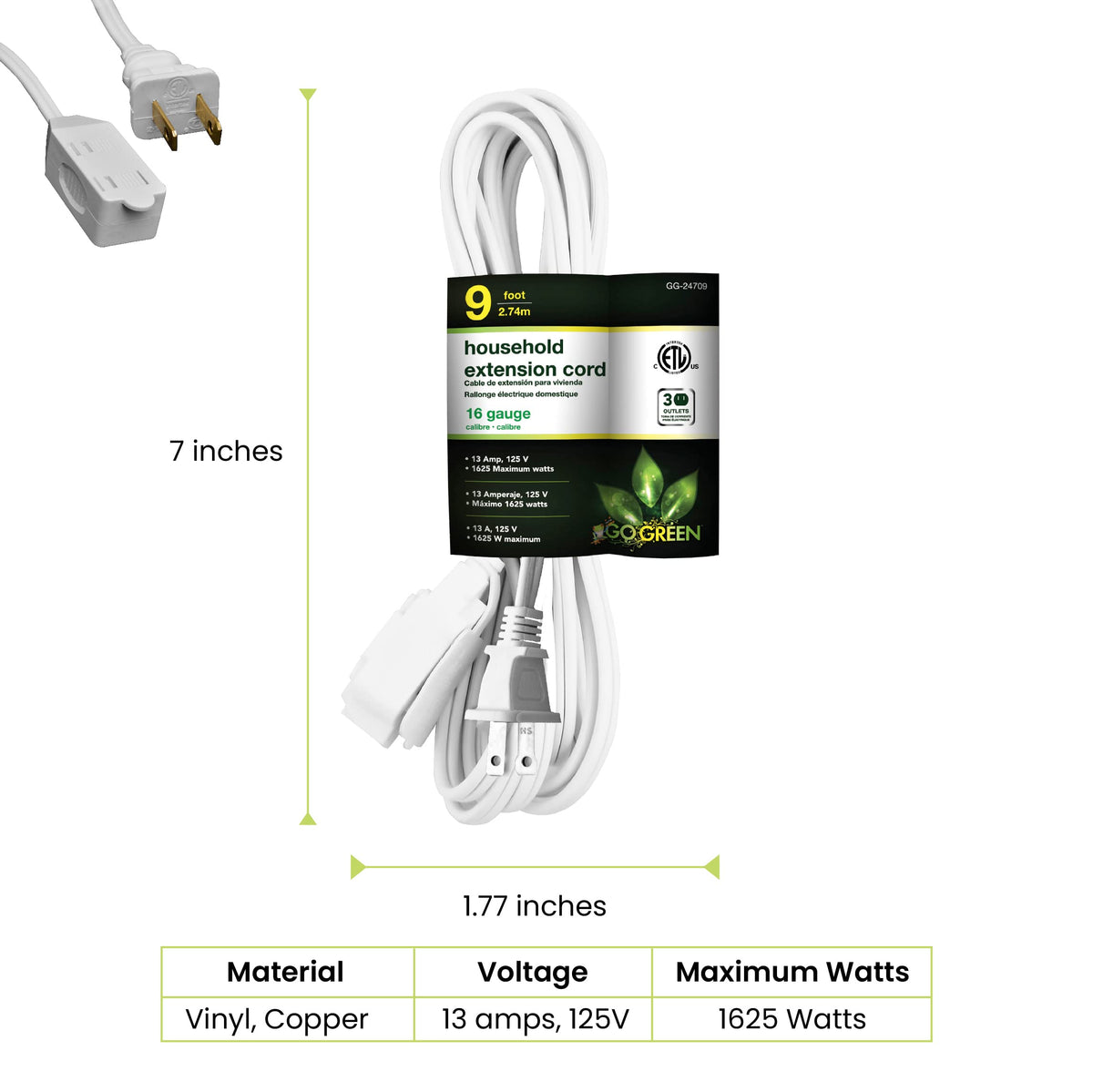 Gogreen Powers� (Gg-24709) 2-Prong Extension Cord Comes Equipped With 3 Outlets And Is Rated For Indoor Use Only. The Household Extension Cord Is 9 Feet Long. Each Extension Cord Is Fixed With A Child Safety Cover For Extra Protection. The 16 Gauge Kink-Free Cord Is Safe And Reliable, Providing Superb Insulation. It Can Be Plugged Into A Standard 3-Prong 120V Ac Outlet. The Molded Plugs Ensure A Snug And Secure Fit And Avoid Detachment From The Wire. Perfect For Daily Use, This 16/2 Spt-2 Cord Is Cetl Listed And Meets All Industry Standards. The Indoor Extension Cord Is Rated For A Maximum Of 13 Amps, 1625 Watts, 125 Volts. Perfect For Devices Such As Lamps, Phone Chargers, Fans, Heaters, And Many Other Electronics. By Purchasing This 3 Outlet Household Extension Cord, You Not Only Will Get A High-Quality Product; But Also Get Ecological Peace Of Mind With Hassle-Free Recycling. We Offer Free Recycling And Free Shipping Back Of The Used Product To Our Recycling Facility. Please View The Recycling Code And Instructions On The Back Of The Package And Visit The Gogreen Power Website For Additional Information.