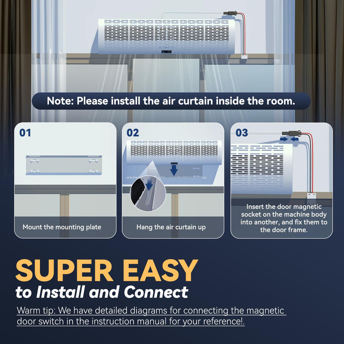 Hanchen Air Curtain Has A Powerful Low Noise Airflow, Which Can Effectively Separate Indoor Air From Outdoor Hot/Cold Air, Dust, Insects, Etc. The Indoor Air Curtain, Made Of Aluminum Alloy Material, Keeps The Conditioned Air Inside And Avoid The Entry Of Hot/Cold Air, Smoke And Other Foreign Objects. Parameters Product Name: Commercial Indoor Air Curtain Model: Ms-40 Control Method: Magnetic Door Switch + Mechanical Button + Remote Control Product Color: White Voltage: 110V Frequency: 60Hz Power: 180W(High Speed), 145W(Low Speed) Air Volume: 1527 Cfm(High Speed), 1292 Cfm(Low Speed) Noise Level: 62 Db Net Weight: 25.3Lb Machine Size: 40X6X10 In Note This Is Not An Air Conditioner But An Air Curtain. Air Curtain Wont Generate Cold And Hot Air. If You Need A Machine That Can Heat Or Cool Indoor Air, Please Do Not Purchase Our Model. All Products Will Be Checked And Packaged In Good Condition Before Shipping. We Provide One Year Warranty For Every Our Customer. If You Have Any Questions, Please Feel Free To Contact Us Directly. We Will Give You A Reply As Soon As Possible. Thanks For Your Patience And Understanding.