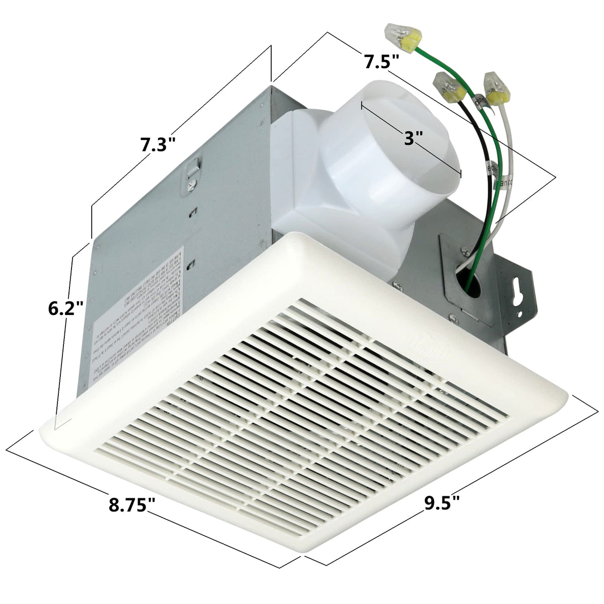 Sones: 2 (Approx. 40 Decibels) Galvanized Steel Housing Quick-Connect Wiring Ul Listed For Over Tub And Shower With Gfci 3-Inch Duct Outlet Joist Mount Installation Housing Dimensions: 7.5 Inches Wide X 7.3 Inches Long X 6.2 Inches High (7.5'' W X 7.3'' L X 6.2'' H). Watts: 25 Vac: 120