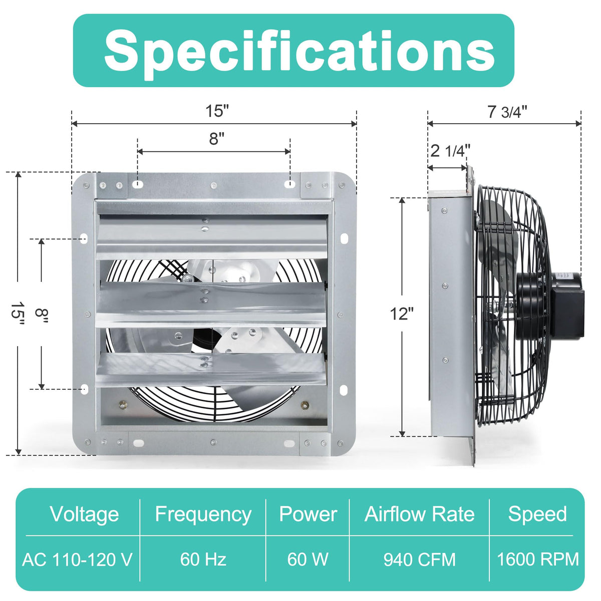 12 Inch Shutter Exhaust Fan Can Be Widely Used As Attic Fan, Greenhouse Fan, Shop Fan, Garage Fan, Kitchen Fan, Bathroom Fan, Chicken Coop Fan For Ventilation.Specification:Voltage: Ac 110-120 V Frequency: 60 Hz Power: 60 Wairflow Rate: 970 Cfmspeed: 1680 Rpm