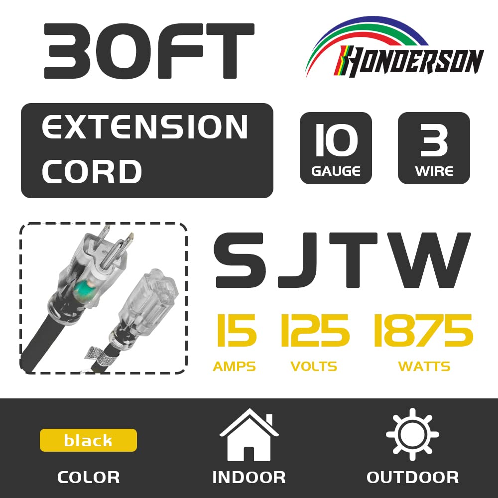 Honderson 30Ft Lighted Outdoor Extension Cord 10/3 Sjtw Heavy Duty Black Extension Cable With 3 Prong Grounded Plug For Safety